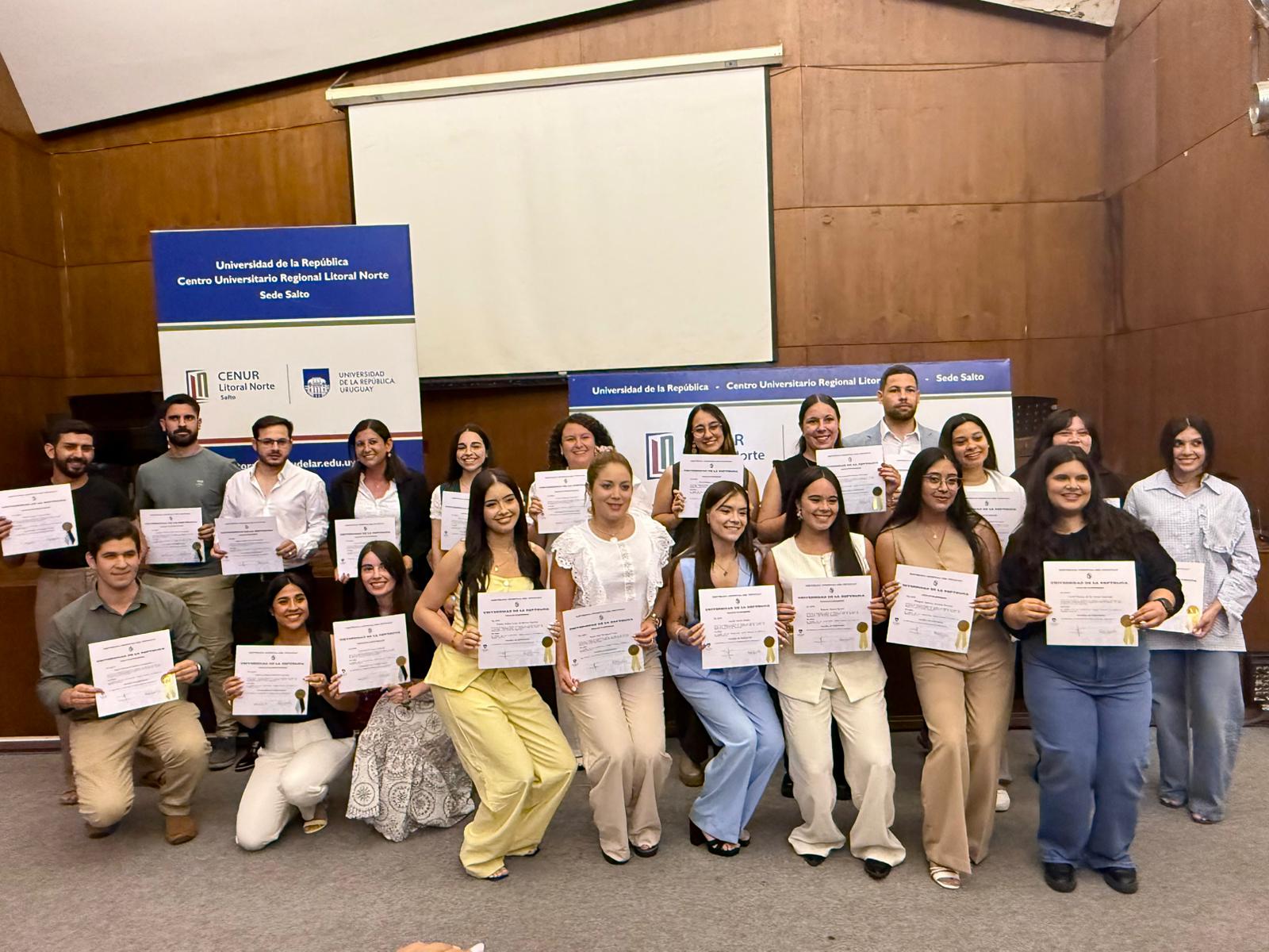 En la jornada de este lunes 15 de diciembre se realizó la última Entrega de Títulos del presente año en sede Salto del Cenur Litoral Norte de la Universidad de la República. En esta oportunidad fueron 27 los títulos entregados a egresados de seis diferentes carreras o tramos de estas cursados de forma completa en la sede universitaria local.