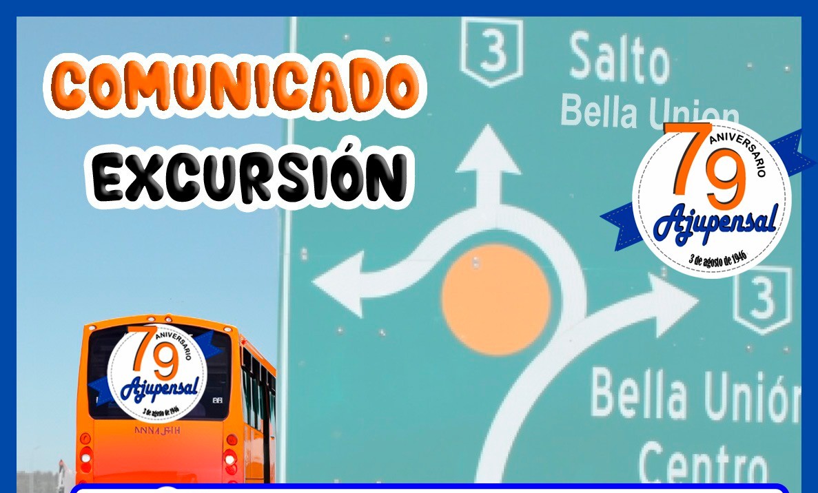 La Sub Comisión de Turismo Social de A.JU.PEN.SAL. informa a sus asociados que, por motivos de fuerza mayor, la excursión prevista a la ciudad de Bella Unión para el día sábado 6 de setiembre, se realizará el sábado 13 de setiembre, partiendo desde nuestra Institución a la hora 07:30.