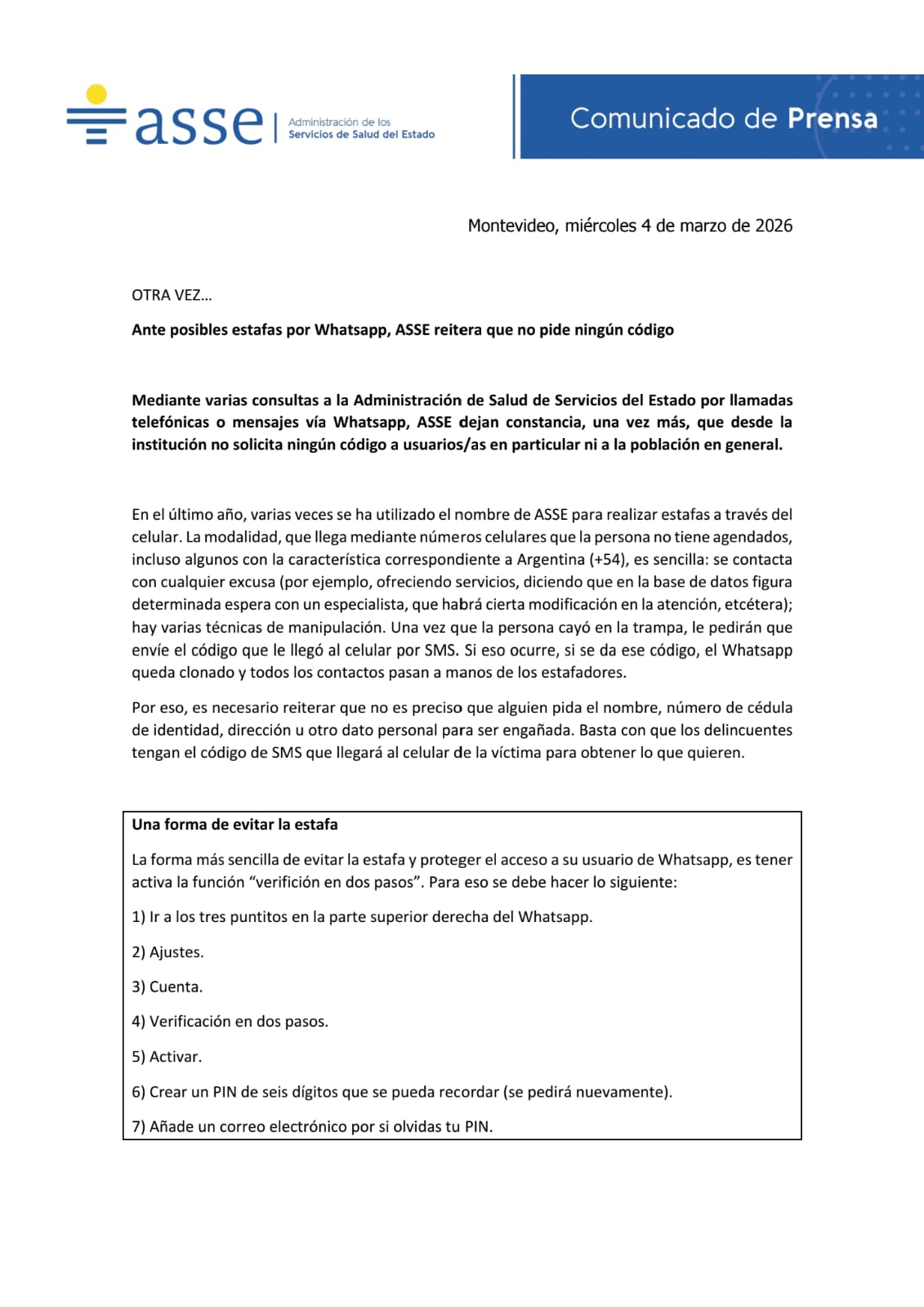 NOTICIAS / SERVICIOS A LA COMUNIDADAnte posibles estafas por Whatsapp, ASSE reitera que no pide ningún código 4 marzo, 2026