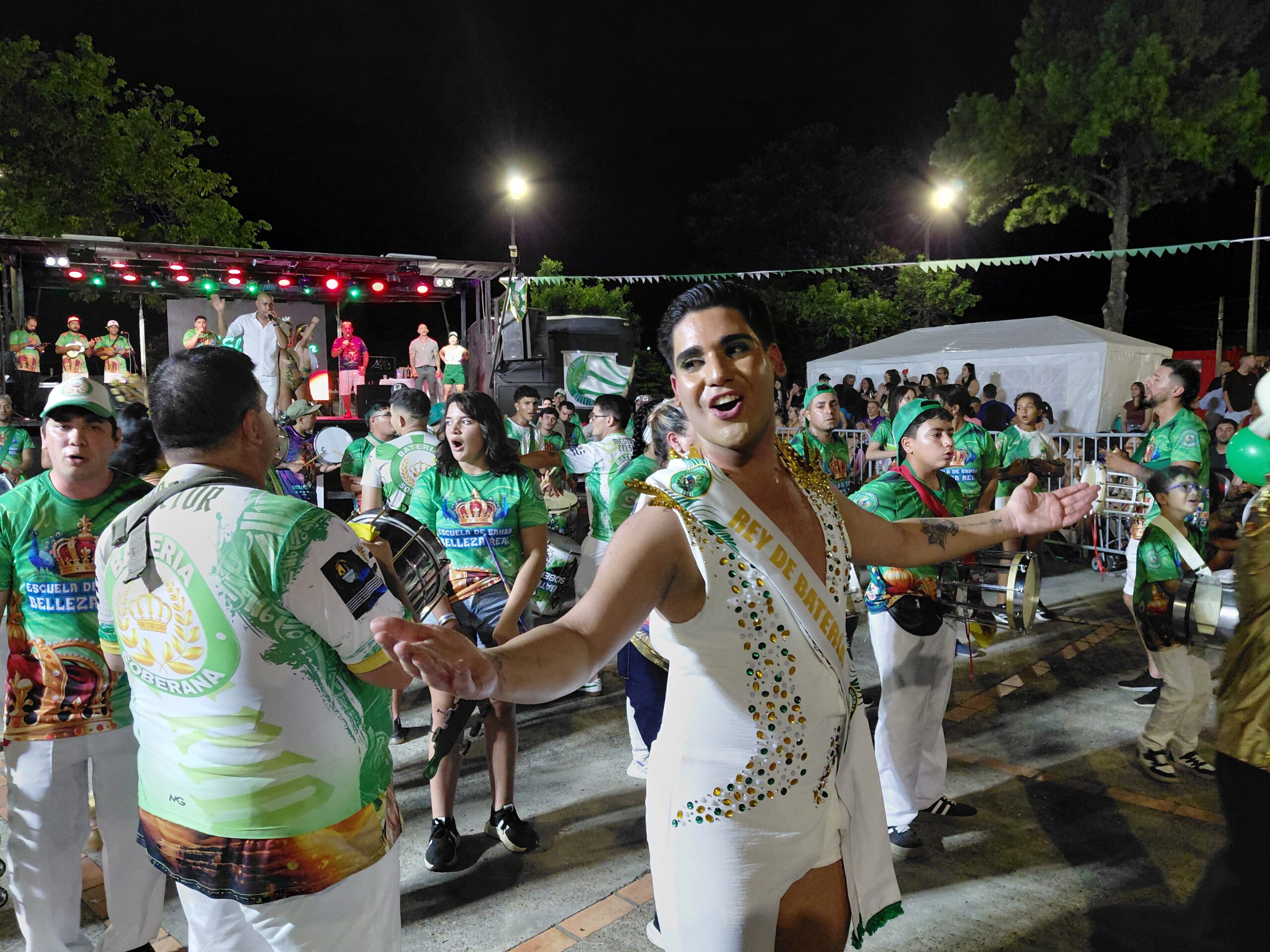 Antes de su presentación, como se viene haciendo en todas las instancias de esta naturaleza, las distintas escuelas de samba de Salto participaron de las actividades sobre el escenario, en una plaza desbordante de público que esperaba no solo para disfrutar de los espectáculos que ofrecieron las visitantes, sino además para aplaudir a la anfitriona y dueña de casa, Belleza Real.