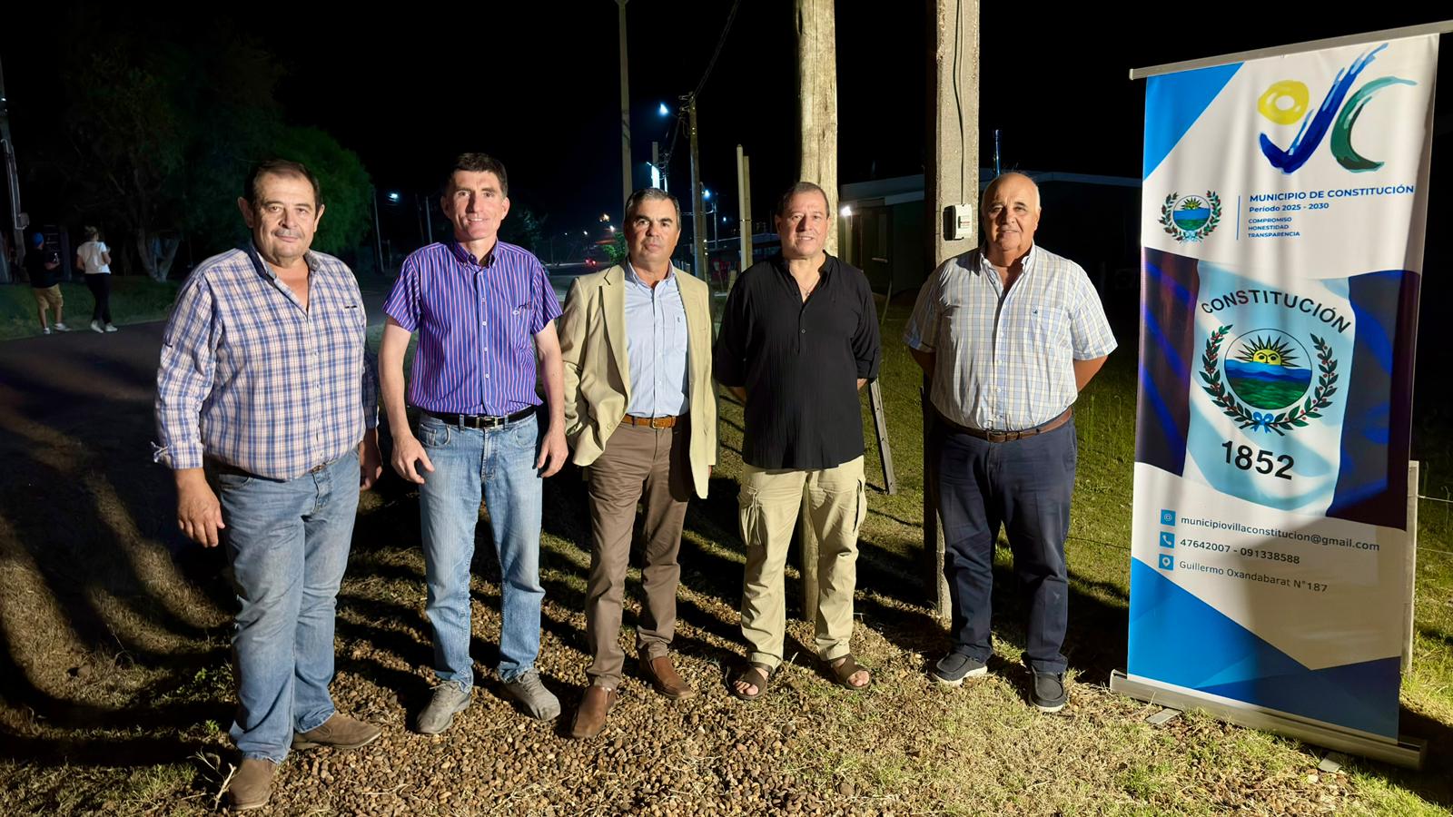 El intendente interino de Salto, Francisco Blardoni, y el director de Descentralización, Daniel Galliazzi, participaron del encendido del nuevo sistema de alumbrado público en el barrio MEVIR V, ubicado en la intersección de Ituzaingó y Juan Chúa, en la localidad de Villa Constitución.