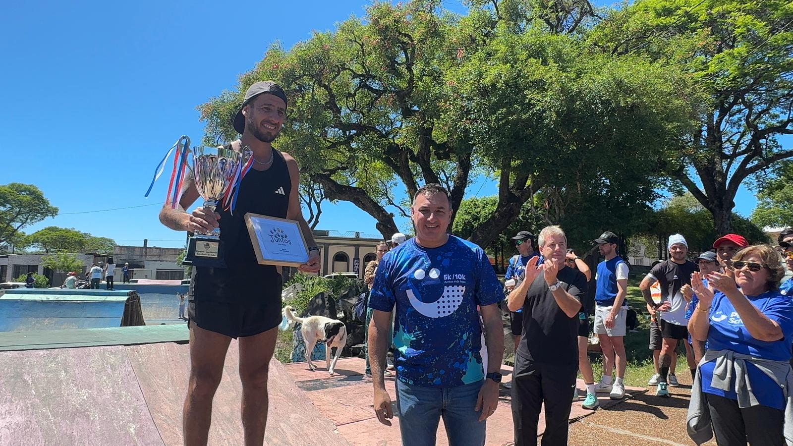 El intendente de Salto, Carlos Albisu, junto al coordinador de Deportes, Marcelo García da Rosa, participaron en la entrega de premios de la primera edición local de la correcaminata y maratón solidaria de 5K y 10K organizada por la Fundación Pérez Scremini, institución que trabaja a nivel nacional en la lucha contra el cáncer infantil y adolescente.
