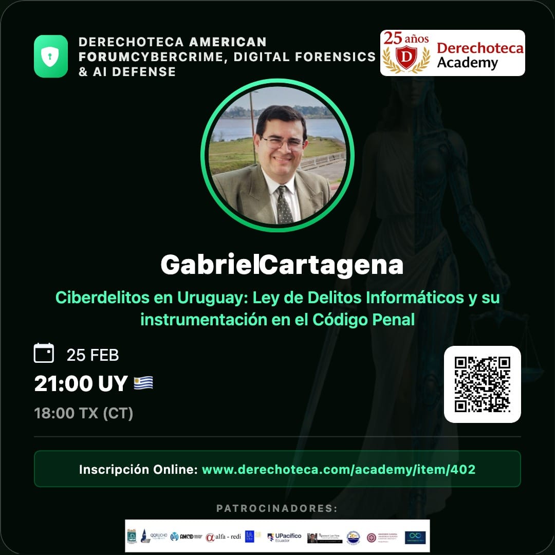 El Dr. Gabriel Cartagena Sanguinetti, abogado y docente de Informática Jurídica, participará como expositor en un nuevo evento internacional organizado por la Derechoteca Academy, en el marco del Derechoteca American Forum Cybercrime, Digital Forensics & AI Defense.