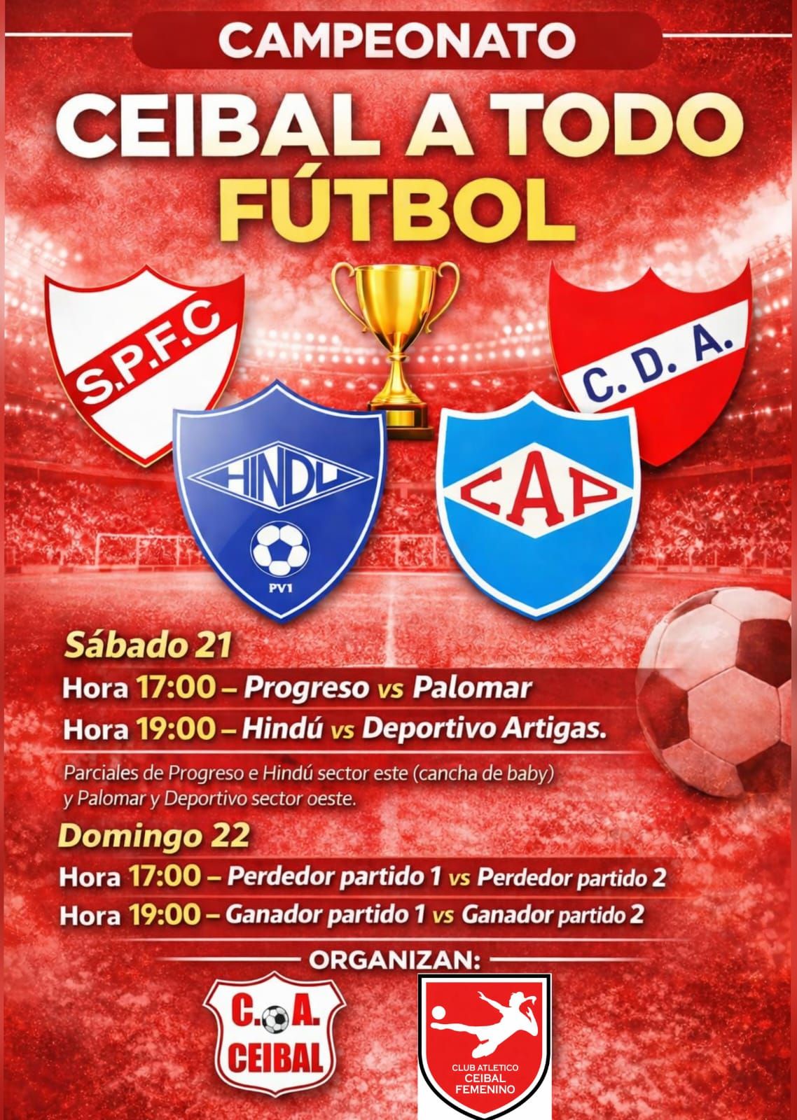 DEPORTESCeibal a todo fútbol: Torneo Amistoso con Clubes de la Divisional Primera B 19 febrero, 2026 Este fin de semana se viene Ceibal a todo fútbol, primer torneo del año con equipos de la Divisional B. Día Sábado, parciales de Progreso e Hindú ingresan sector este, parciales de Deportivo Artigas y Palomar ingresan sector oeste.