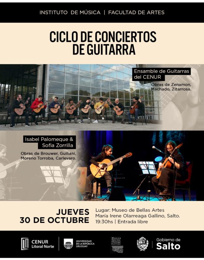 El próximo jueves 30 de octubre, el Museo de Bellas Artes María Irene Olarreaga Gallino, en Salto, será escenario de una nueva edición del Ciclo de Conciertos de Guitarra, organizado por el Instituto de Música de la Facultad de Artes (Universidad de la República), con el apoyo del Gobierno de Salto. La cita es a las 19:30 horas, con entrada libre.