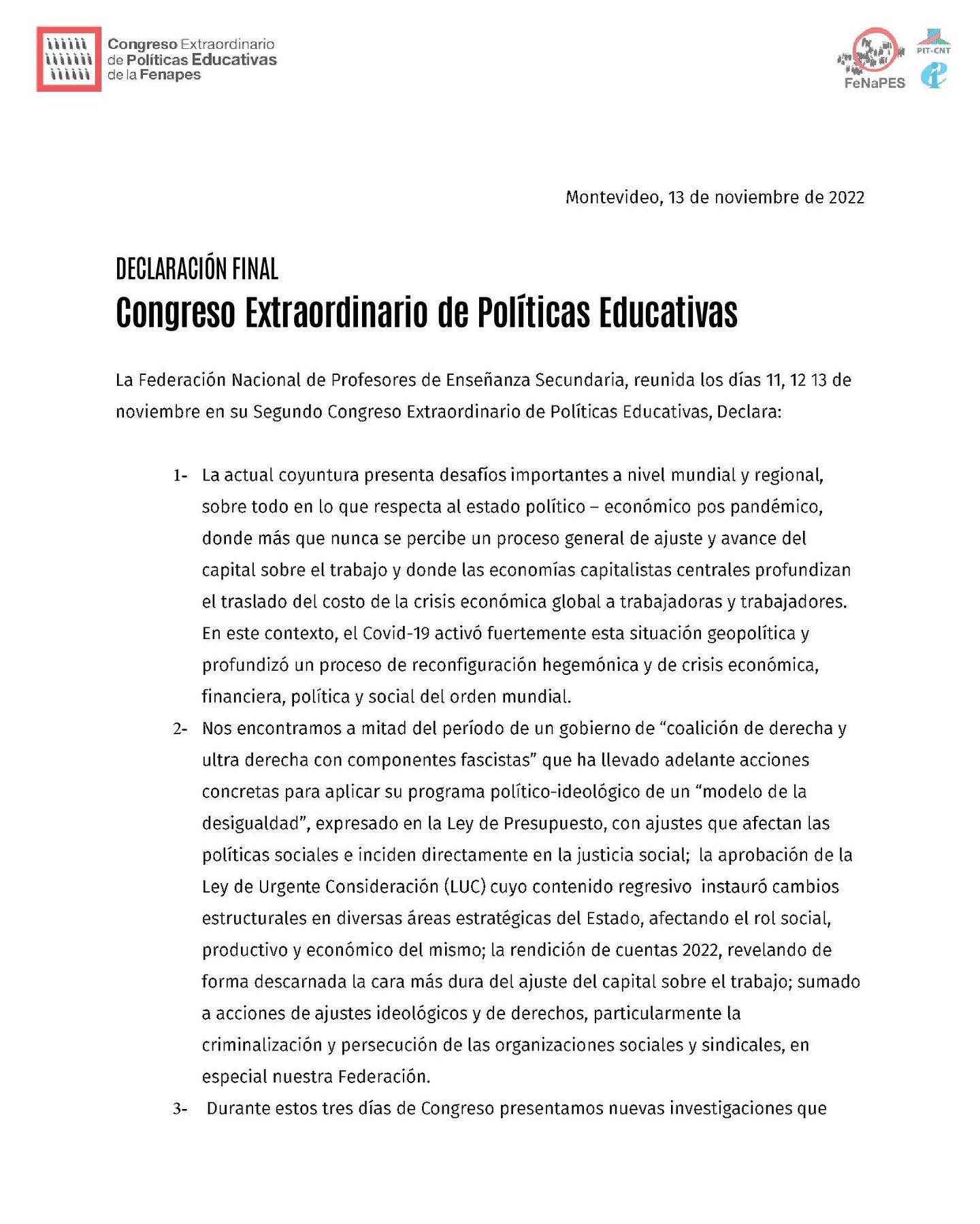 LOCALES / NOTICIASDeclaración final del Congreso Extraordinario de Políticas Educativas de la Fenapes 14 noviembre, 202214 noviembre, 2022 - Deja un comentario