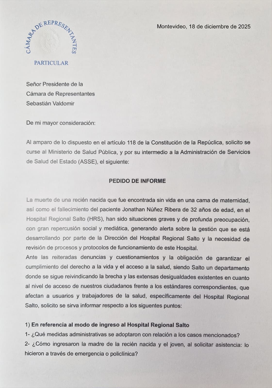 El diputado Pablo Constenla presentó un pedido de informes al Ministerio de Salud Pública (MSP) y a la Administración de los Servicios de Salud del Estado (ASSE), tras los graves hechos ocurridos en el Hospital Regional Salto, que incluyen el fallecimiento de una recién nacida y del paciente Jonathan Núñez Ribera.