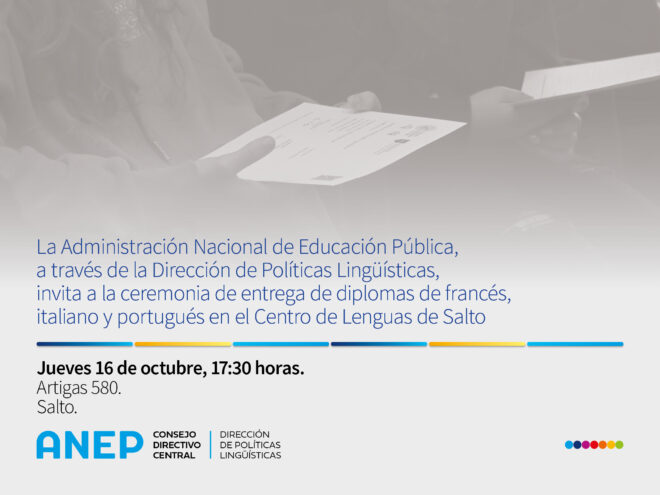 El jueves 16 de octubre, a las 17:30 horas, el Centro de Lenguas Extranjeras de Salto realizará la ceremonia de entrega de diplomas a los alumnos egresados de los cursos de Ciclo Básico, Bachillerato y Profundización del año 2024.