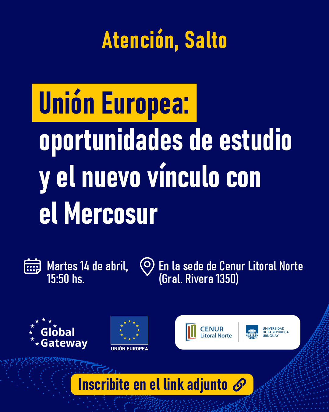 El Embajador de la Unión Europea en nuestro país, Petros Mavromichalis acompañado de una delegación diplomática brindará una charla abierta en el Aula Magna de la sede Salto de la Universidad de la República el próximo martes 14 de abril. En la misma se prevé informar sobre becas universitarias de la Unión Europea, así como una charla sobre el Acuerdo Unión Europea – Mercosur. La misma es abierta a todo público, donde especialmente se invita a estudiantes y docentes universitarios o de enseñanza superior no universitaria.