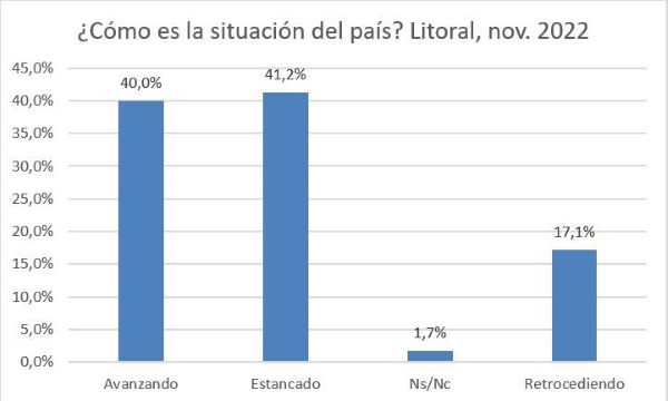 La percepción sobre la situación del país muestra que un 40% de los habitantes de la zona del litoral consideran que está avanzando, pero que algo más del 41% perciben estancamiento. Son muchos menos lo que manifiestan que el país está retrocediendo.