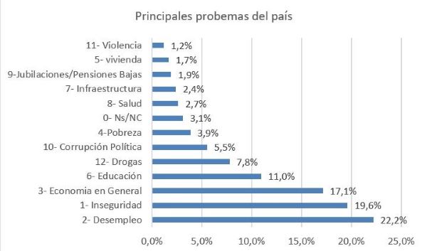 Los tres principales problemas que predominan se mantienen con relación a mediciones anteriores, aunque con diferentes ponderaciones para cada uno. Hay dos asuntos que irrumpen con más fuerza en la arena de la discusión pública: por una parte, el tema de la «educación», que por primera vez supera los dos dígitos de manifestaciones, y el otro es el problema de las «drogas», que se ubica casi en un 8%. Ya sea por la reforma educativa en marcha, o por las noticias generadas en torno al narcotráfico y sus efectos, ambos temas aparecen en la agenda con crecientes cifras en esta zona del país.