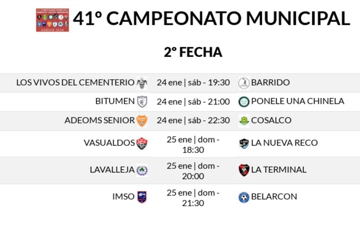 DEPORTESEste fin de semana se juega la Segunda Fecha del Campeonato de Fútbol Municipal 23 enero, 2026 Sábado 24 de enero 19:30 — Los Vivos del Cementerio vs Barrido 21:00 — Bitumen vs Ponele una Chinela 22:30 — Adeoms Senior vs Cosalco Domingo 25 de enero 18:30 — Vasualdos vs La Nueva Reco 20:00 — Lavalleja vs La Terminal 21:30 — Imso vs Belarcon