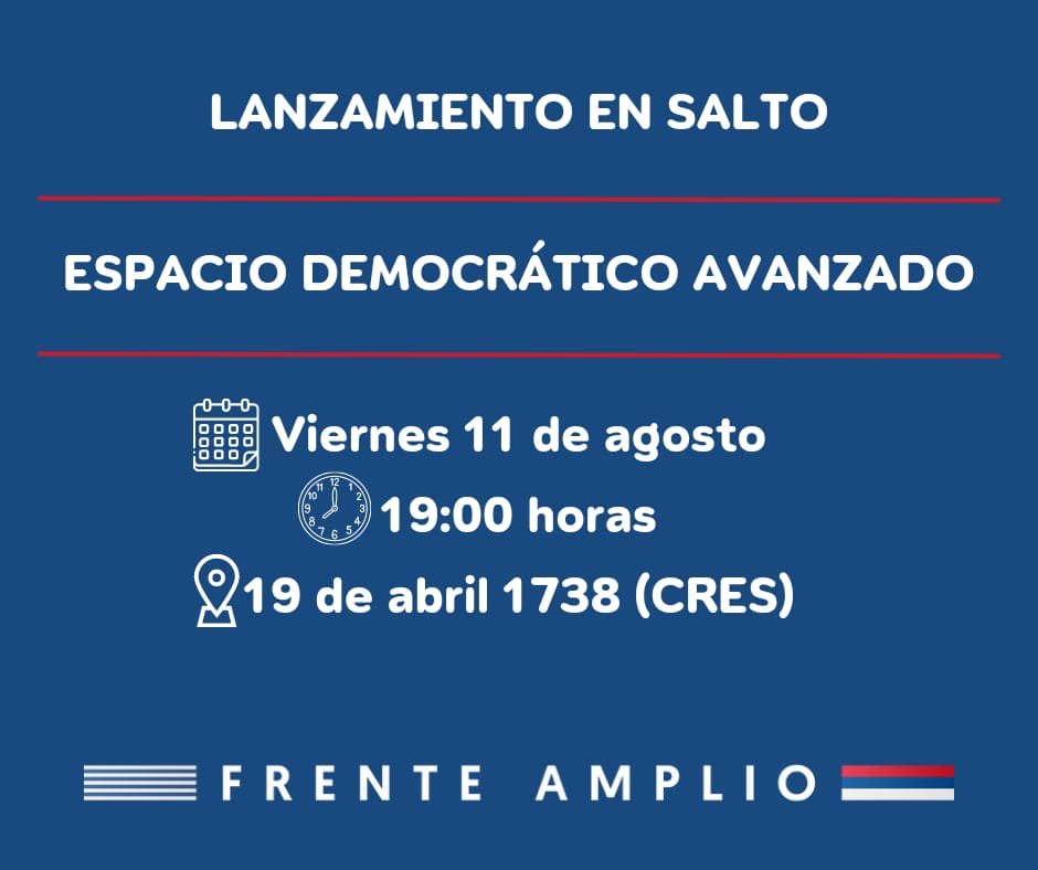 El próximo viernes 11 a las 19 horas se llevará a cabo en el Cres, el acto de lanzamiento del Espacio Democrático Avanzado. Este nuevo espacio reúne al Partido Comunista, el Frente Izquierda de Liberación, compañeros y compañeras independientes, y agrupaciones locales. “El propósito central es comenzar a trabajar de manera conjunta en la proyección política programática, en torno a la candidatura de nuestra compañera Carolina Cosse, así como en el desarrollo político propio del espacio y su coordinación” dijo el dirigente Regino López.