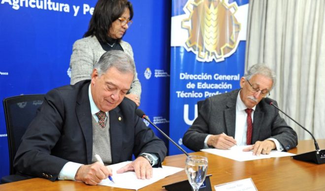 El ministro de Ganadería, Agricultura y Pesca, Fernando Mattos, y el director general de UTU, Juan Pereyra firmaron el convenio que tiene por objetivo complementar y fortalecer los aprendizajes, a la vez de introducir a los estudiantes al ámbito laboral.