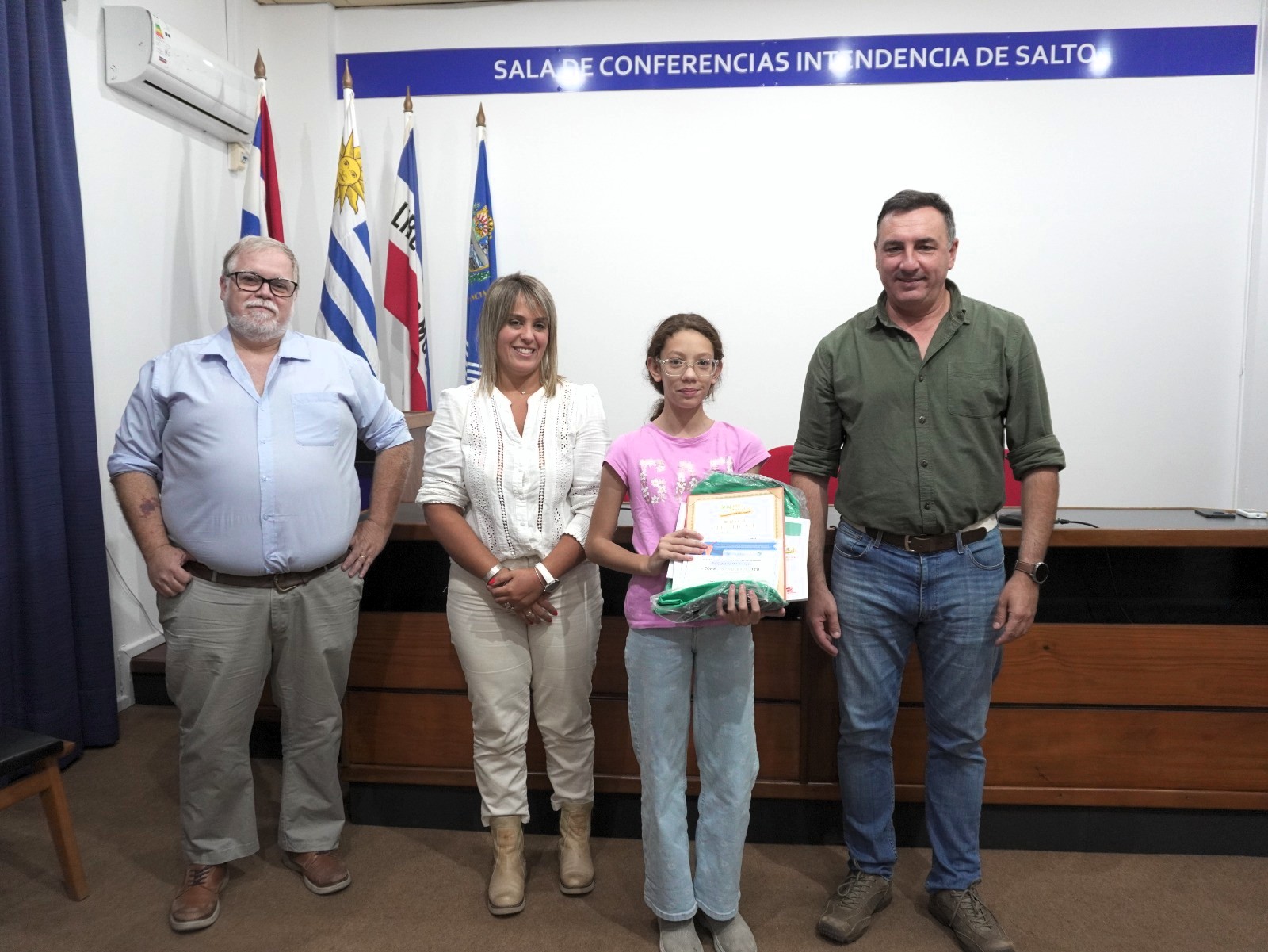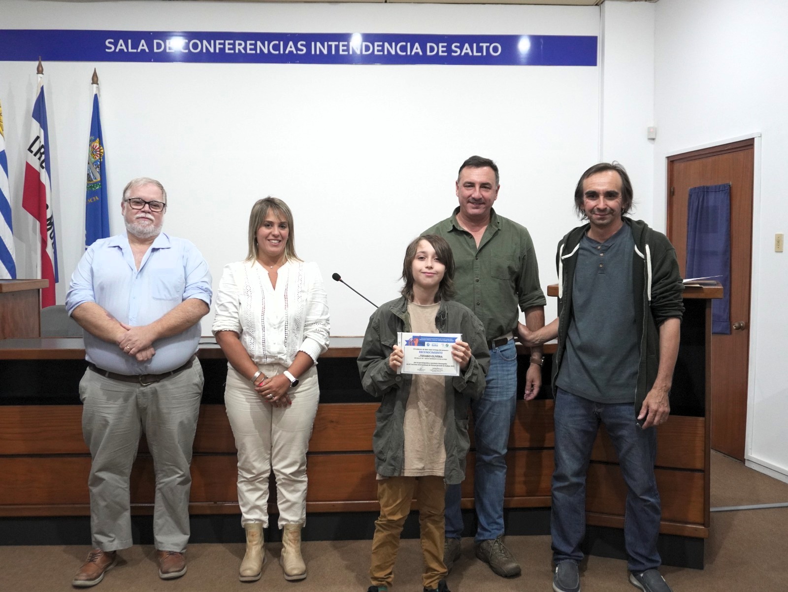 La entrega de premios enviados desde la ciudad de Foshan, junto con los certificados del Gobierno de Salto, estuvo a cargo del intendente de Salto, Carlos Albisu, la coordinadora de Juventud, Lucía Molinari, y el coordinador de Cultura, Pablo Bonet.