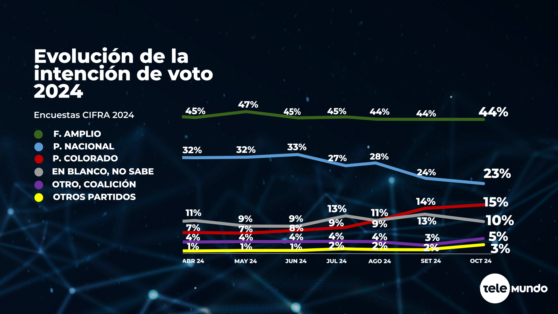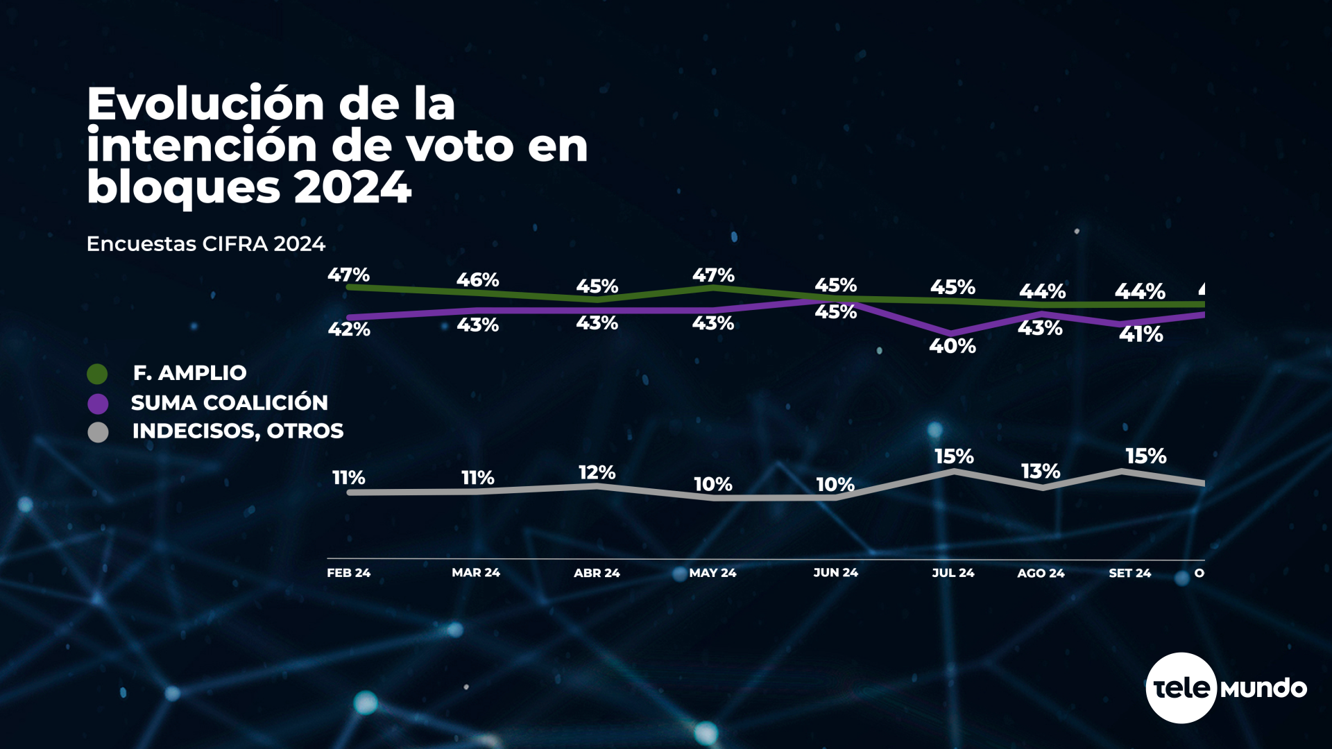 También sube un punto el partido de Salle (Identidad Soberana). Entonces, aunque el Partido Nacional sigue con una tendencia a la baja, los otros socios compensan esa caída y ayudan a que la Coalición en su conjunto mejore su intención de voto. Además, en este último mes, finalmente, están disminuyendo los indecisos, aunque muy lentamente. Siguen quedando casi uno de cada diez electores que no saben qué votarán el domingo.