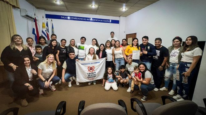 El intendente Andrés Lima y la directora de Vivienda y Hábitat de la Intendencia de Salto, Nelly Rodríguez, entregaron el terreno a las 15 familias que integran la Cooperativa de Viviendas «En Salto un nuevo comienzo», las que se aprestan ahora a comenzar el proceso de construcción en la zona de la ex Chacra Municipal.