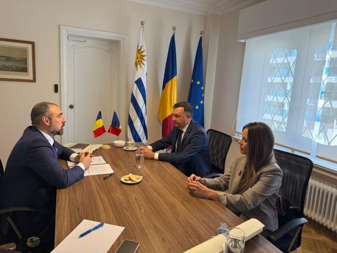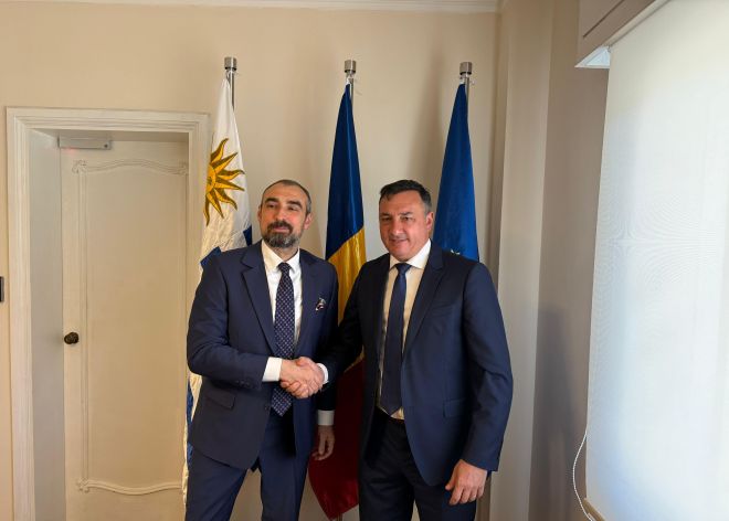 El intendente de Salto, Dr. Carlos Albisu, mantuvo en Montevideo un encuentro con el embajador de Rumania en Uruguay, Radu Mihail Filip, donde se abordaron diversos temas de interés común para ambos territorios. De la reunión también participó la Cra. Vera Facchín, coordinadora de Cooperación Internacional e Inversiones del Gobierno de Salto.