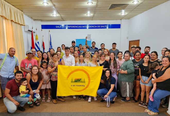 El intendente de Salto, Andrés Lima, y la directora de Vivienda y Hábitat, Nelly Rodríguez, hicieron entrega del permiso de uso del terreno a la cooperativa de viviendas 5 de Febrero, integrada por 29 familias, que ahora iniciará el proceso de construcción de sus nuevos hogares. El terreno se ubica en el predio de la ex Chacra Municipal, en la zona este de la ciudad, área destinada por la presente administración al desarrollo urbano y establecimiento de cooperativas.