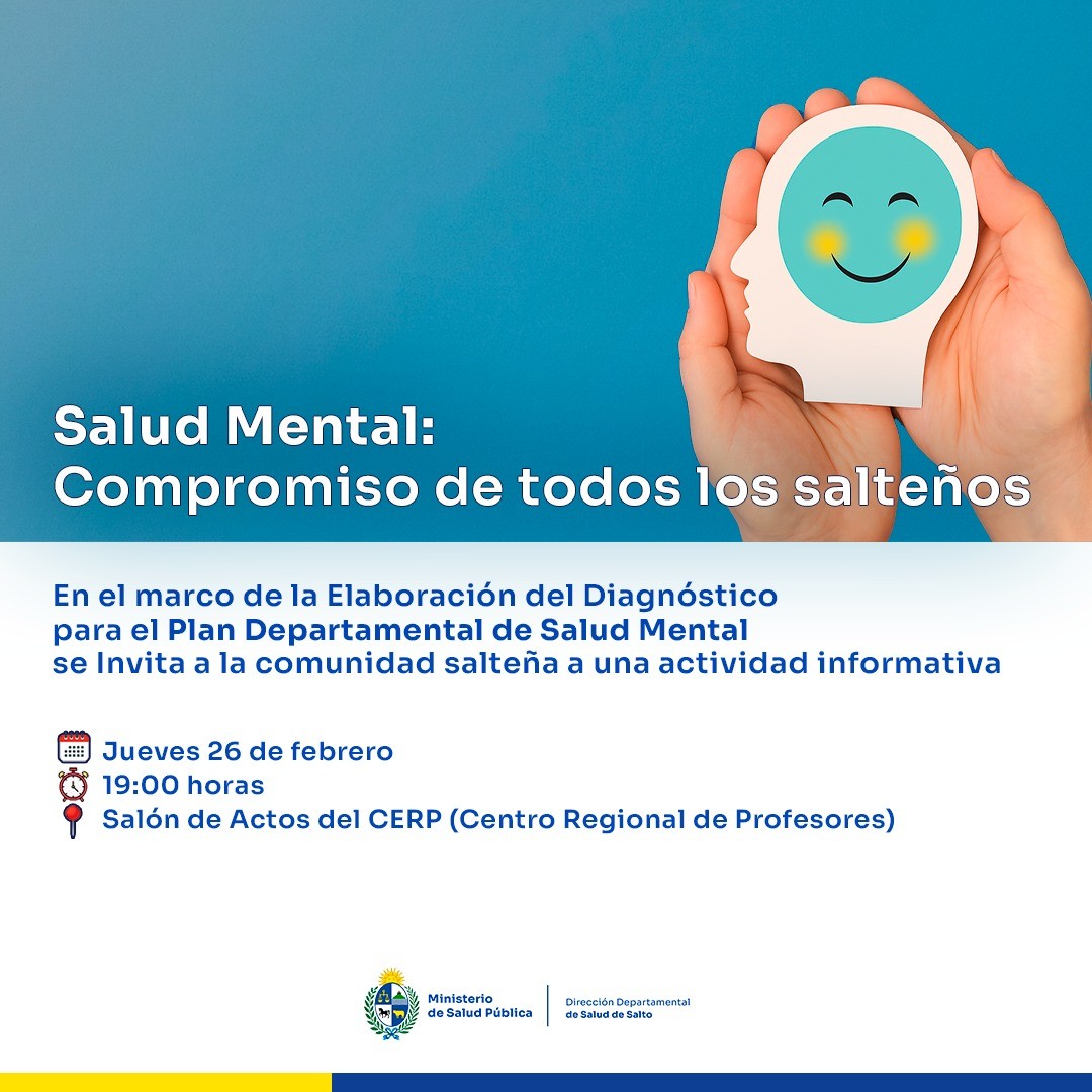 La Dirección Departamental de Salud de Salto informa a la comunidad que llevará adelante dos instancias en el marco de su agenda de promoción y sensibilización en Salud Mental, con el objetivo de fortalecer el compromiso colectivo y generar espacios de información y reflexión.