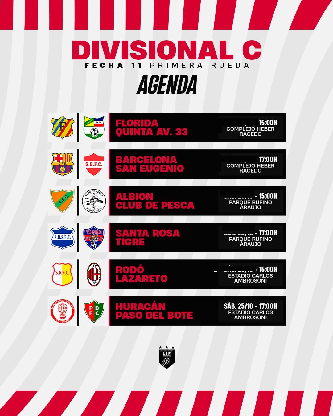 DEPORTESLa Divisional Primera C juega la última fecha de la Primera Rueda 23 octubre, 202525 octubre, 2025 COMUNICADO El Consejo de la Divisional “C” de la LSF comunica que, debido al estado del tiempo, la fecha fijada para hoy se traslada para mañana, manteniendo los mismos detalles.