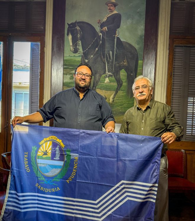 El presidente de la Junta Departamental de Salto, Dr. Enzo Molina Franchini, hizo entrega de la bandera de Salto al profesor Silvio Previale, quien emprenderá una gira por Europa junto a un grupo de acordeonistas, visitando varios destinos y representando una vez más al departamento.
