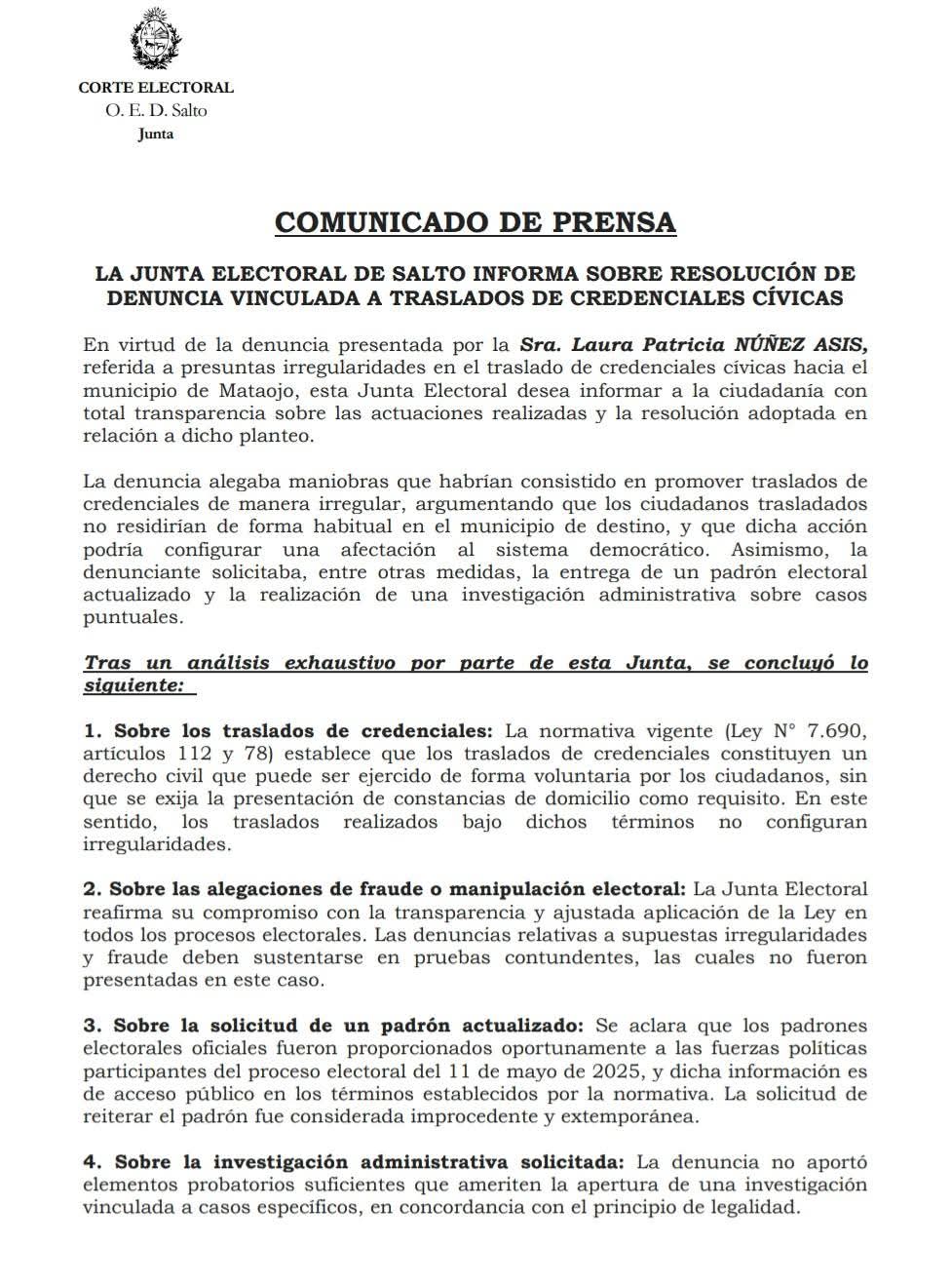 LOCALES / NOTICIASLa Junta electoral de Salto informa sobre resolución de denuncia vinculada a traslados de credenciales cívicas 21 mayo, 2025 - Deja un comentario