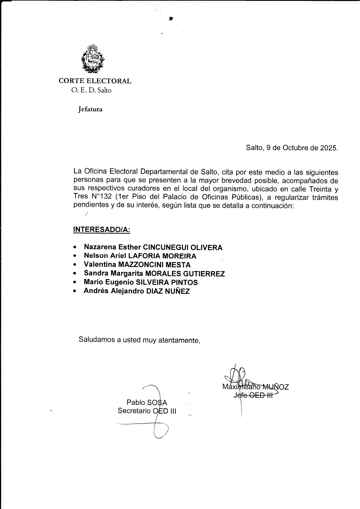 NOTICIAS / SERVICIOS A LA COMUNIDADLa Oficina Electoral de Salto cita a personas para regularizar trámites pendientes 10 octubre, 2025