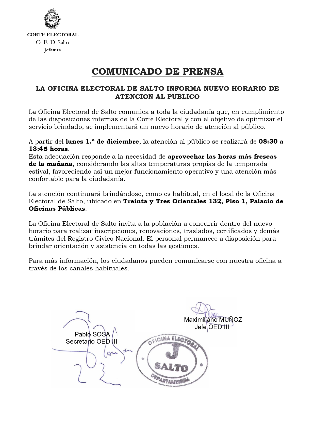 LOCALES / NOTICIASLa Oficina Electoral de Salto informa nuevo horario de atención al publico 28 noviembre, 2025
