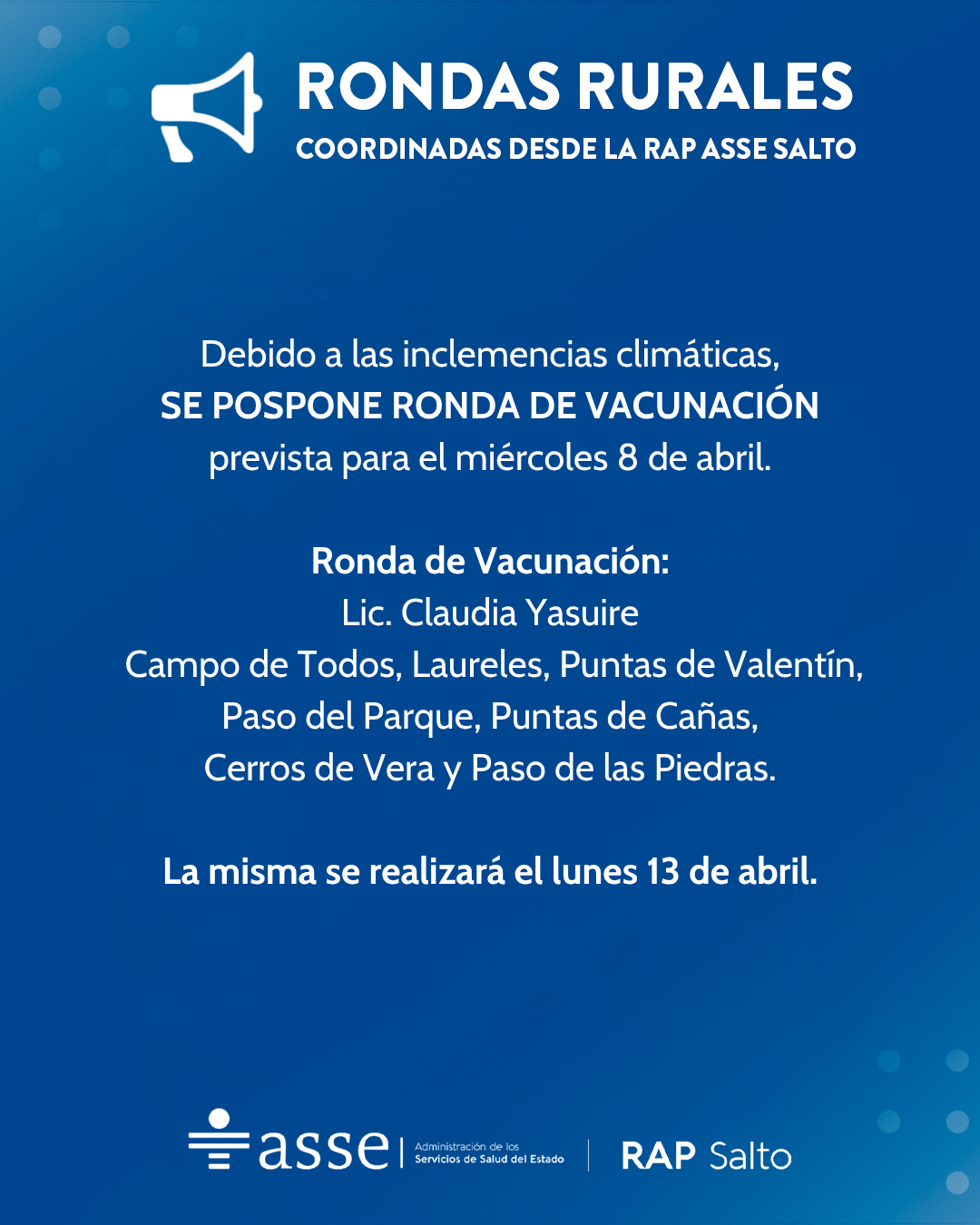 LOCALES / NOTICIASLa RAP ASSE Salto pospone la Ronda de Vacunación de este miércoles por inclemencias climáticas 8 abril, 20268 abril, 2026