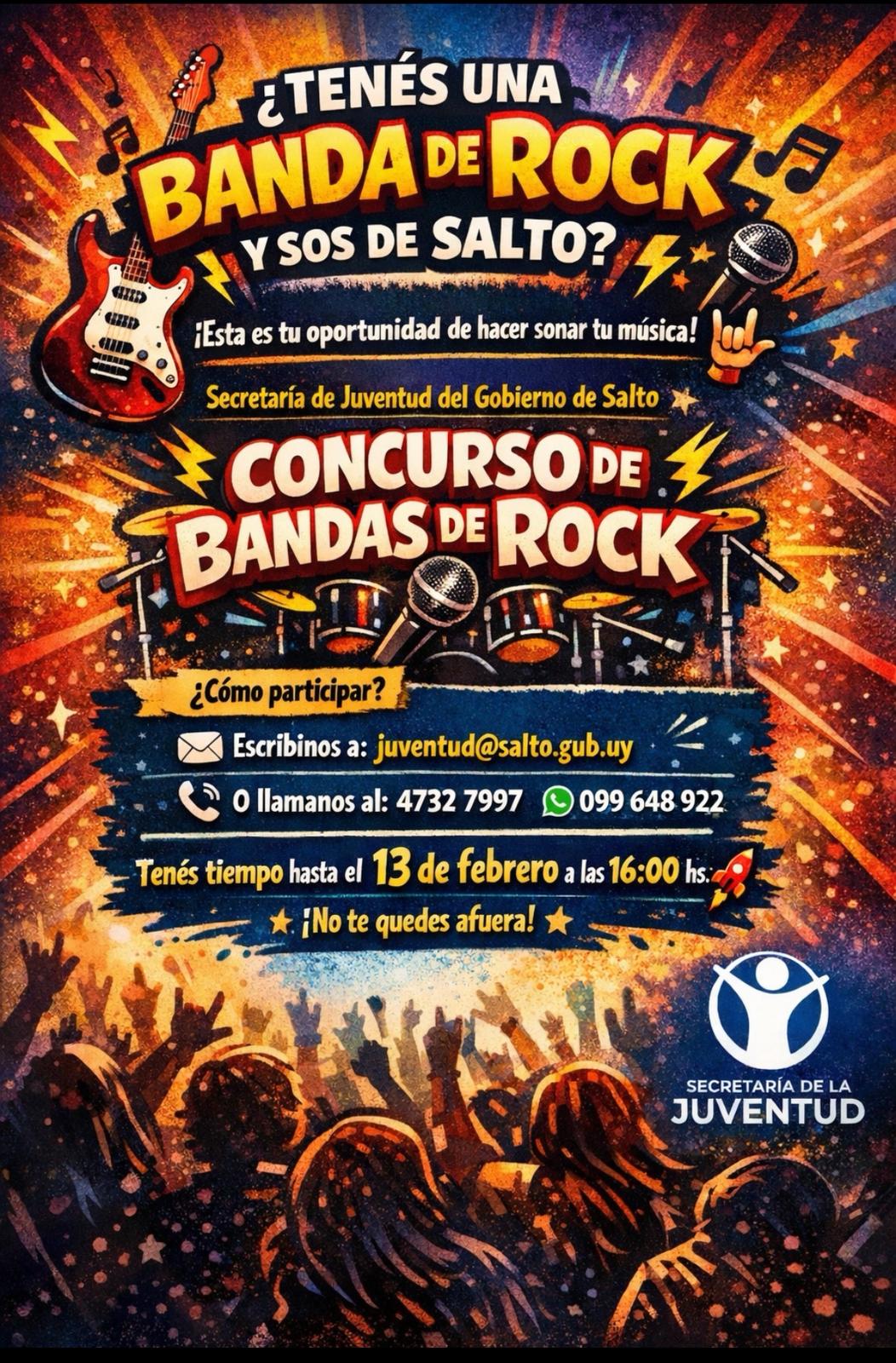 La Secretaría de Juventud del Gobierno de Salto convoca a participar del Concurso de Bandas de Rock, una iniciativa que tiene como objetivo promover y visibilizar el talento musical local, generando un espacio para que los jóvenes artistas puedan hacer sonar su música.