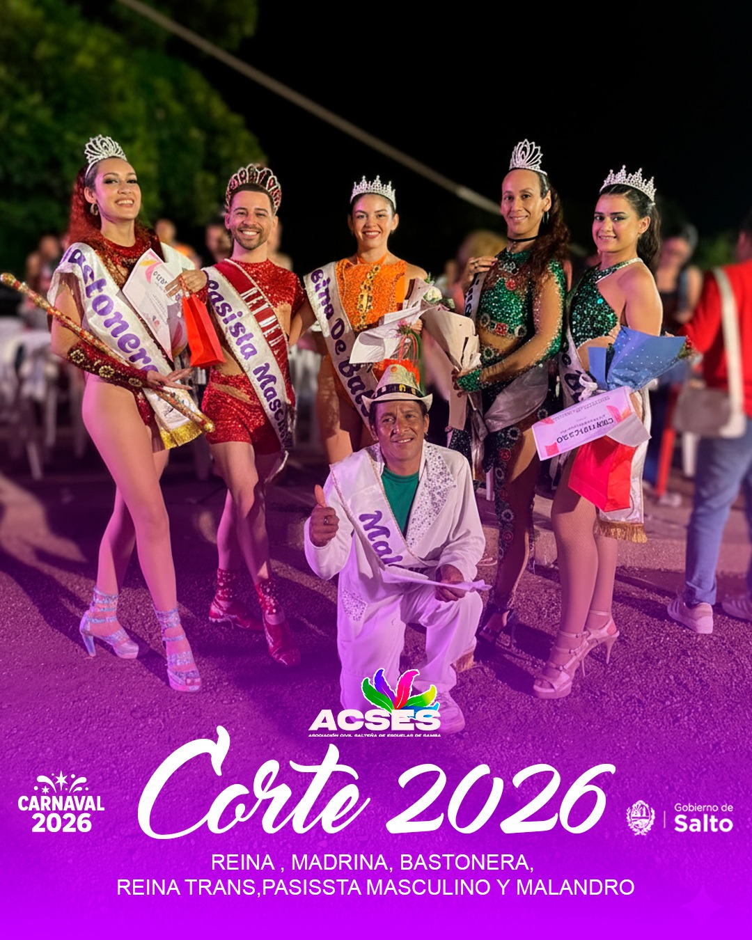 Bastonera fue para Valentina Silgoria de Unidos de la Zona Sur, la Reina Trans 2026 será Daniela Benítez de Escuela Barrio Ceibal, el Pasista Masculino fue para Bruno Scaraffoni de Escuela Barrio Ceibal y el Malandro fue para Francisco González de Belleza Real.