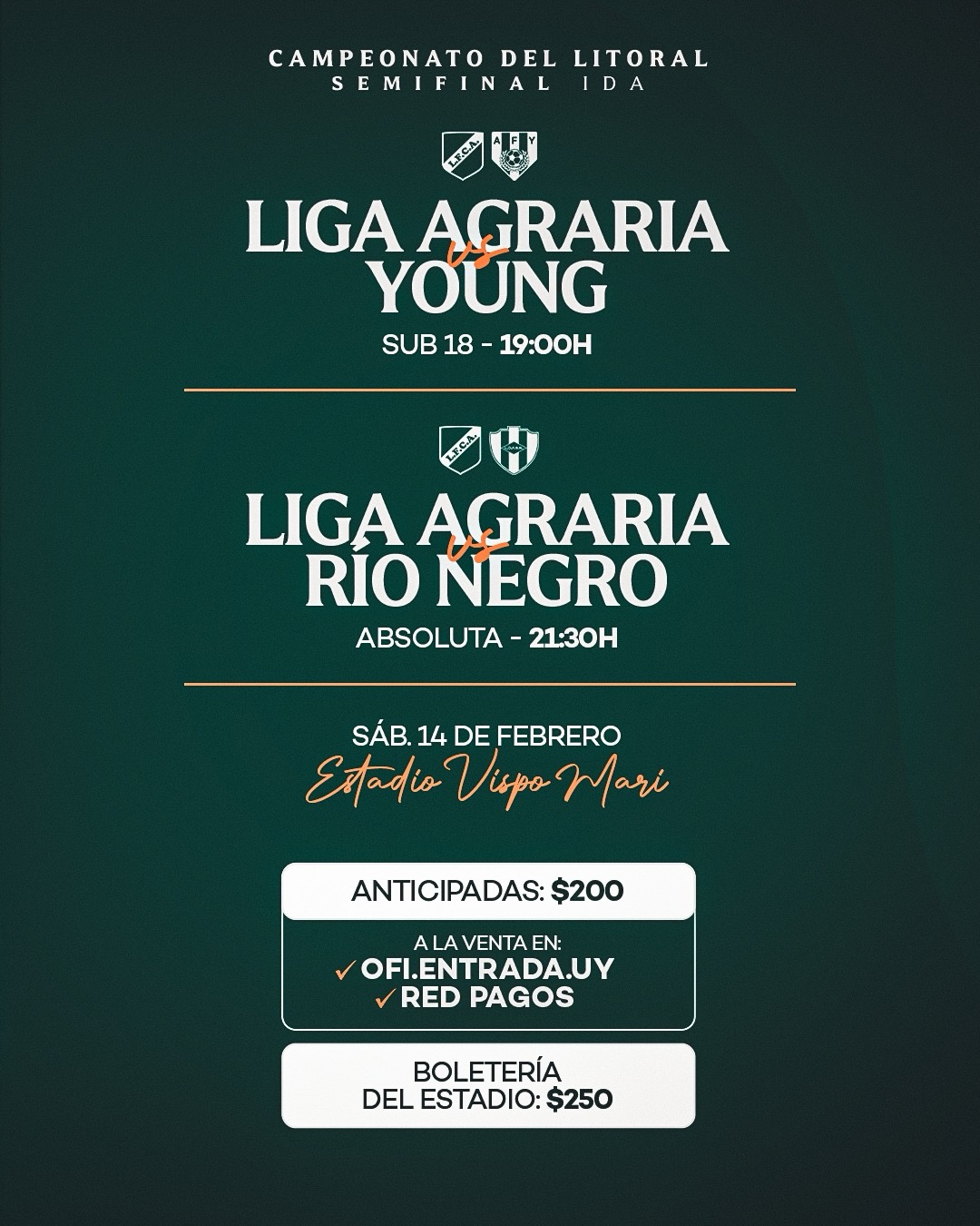 DEPORTESLiga Agraria ganó la protesta en Sub-18 y avanzó a Semifinales 13 febrero, 2026 AHORA SI, ESTAMOS TODOS Young (Sub 18) Río Negro (Absoluta) Entradas anticipadas a la venta en ofi.entrada.uy y en Red Pagos.