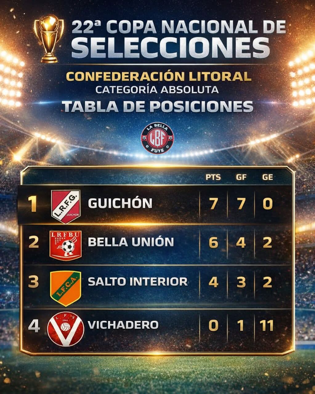 DEPORTESLitoral Absoluta: Liga Agraria venció a Vichadero por 3 a 1 25 enero, 202625 enero, 2026 Mayores Litoral Serie B : Guichon 2 – Bella Union 0 y Vichadero 1 – Liga Agraria 3 . Posiciones : Guichon 7 , Bella Union 6 , Liga Agraria 4 y Vichadero 0.
