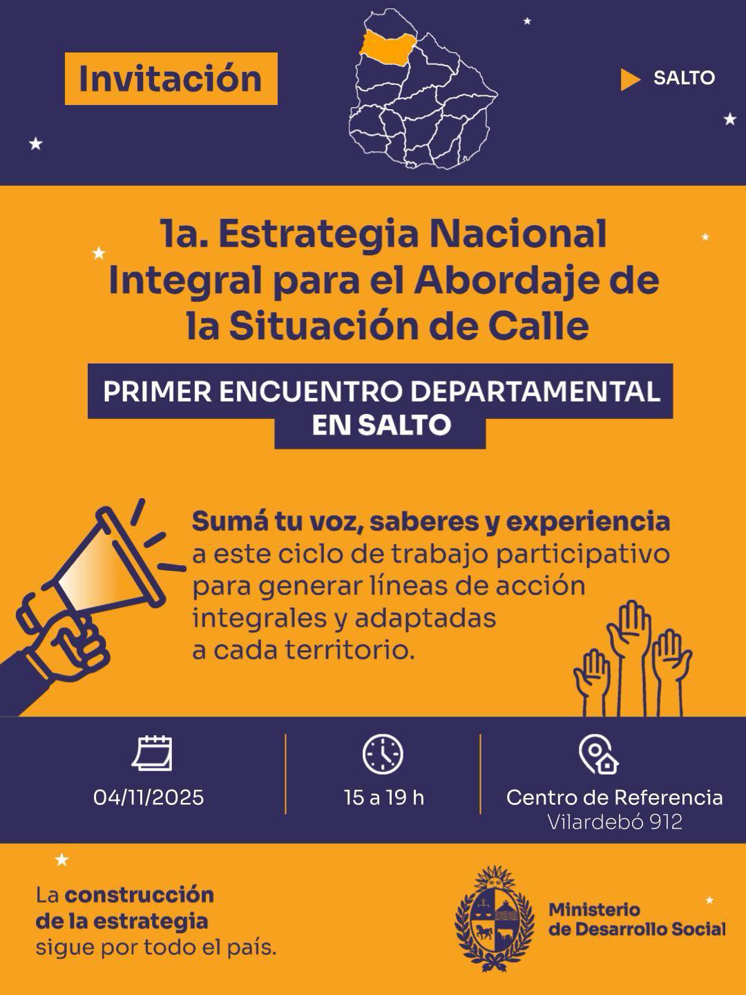 El Ministerio de Desarrollo Social (MIDES) convoca a participar del Primer Encuentro Departamental en Salto, en el marco de la elaboración de la Primera Estrategia Nacional Integral para el Abordaje de la Situación de Calle.