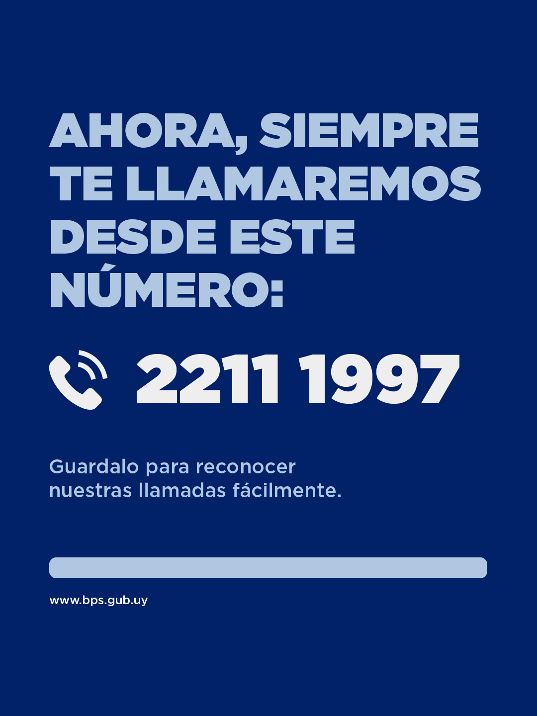 A partir de ahora, y para reforzar la seguridad de los usuarios, todas las llamadas telefónicas realizadas por el BPS se identificarán únicamente con el número 2211 1997.