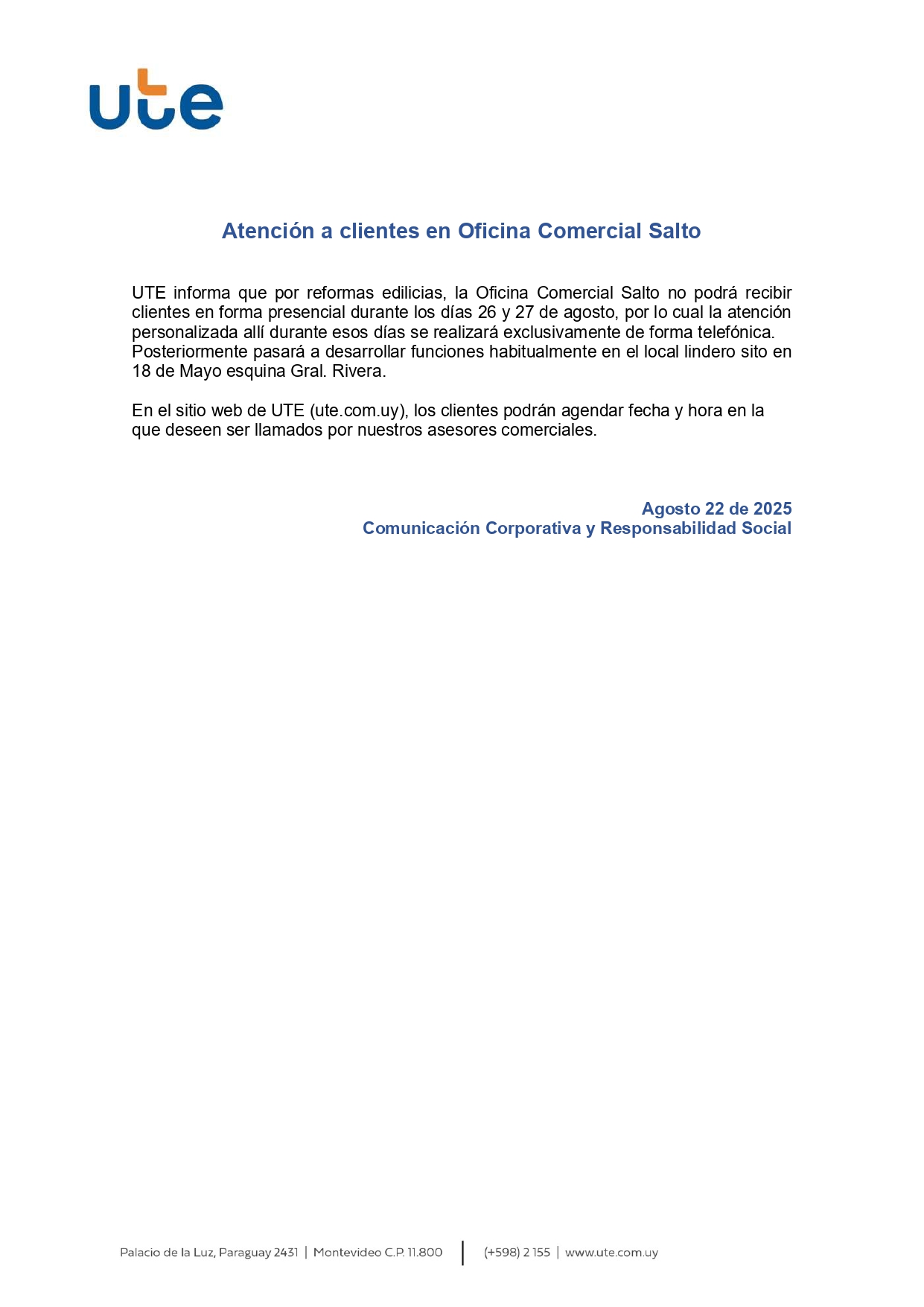 LOCALES / NOTICIASOficina Comercial de UTE Salto no podrá recibir clientes en forma presencial durante los días 26 y 27 de agosto 25 agosto, 202526 agosto, 2025