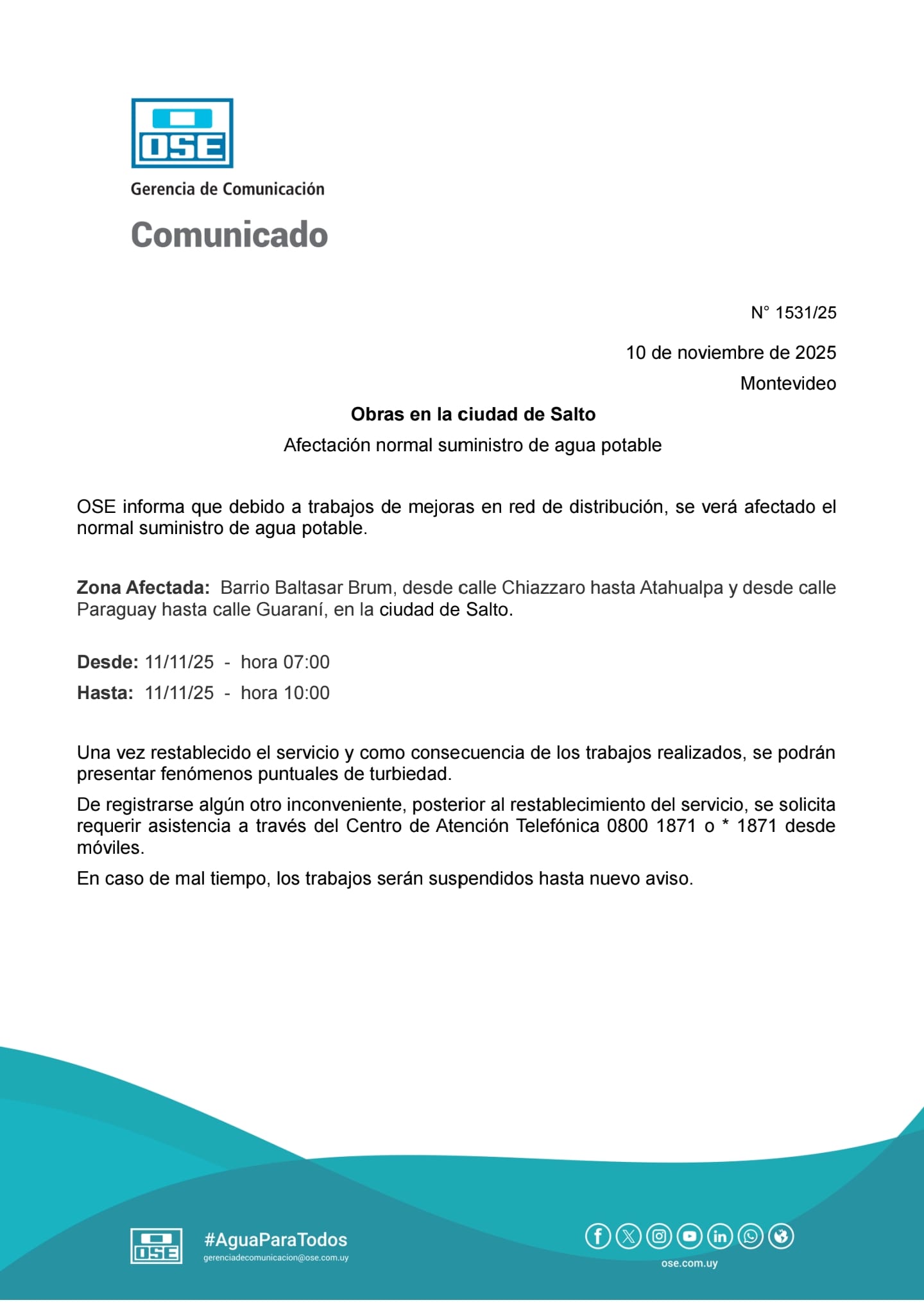 LOCALESOSE realizará este martes 11 de noviembre trabajos que afectarán el suministro en barrio Baltasar Brum 10 noviembre, 202510 noviembre, 2025