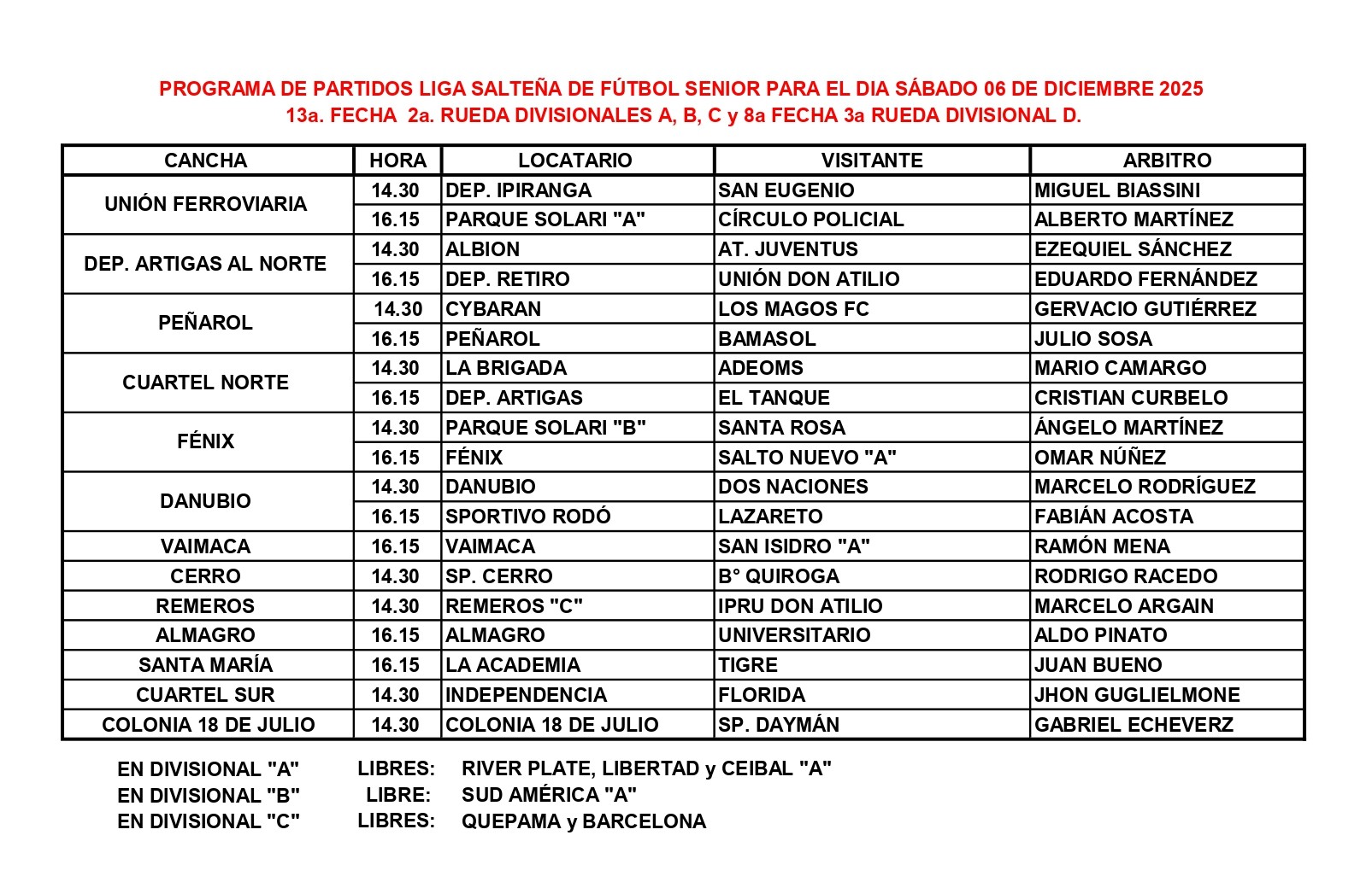 Programa de partidos de la Liga Salteña de Fútbol Senior para este sábado