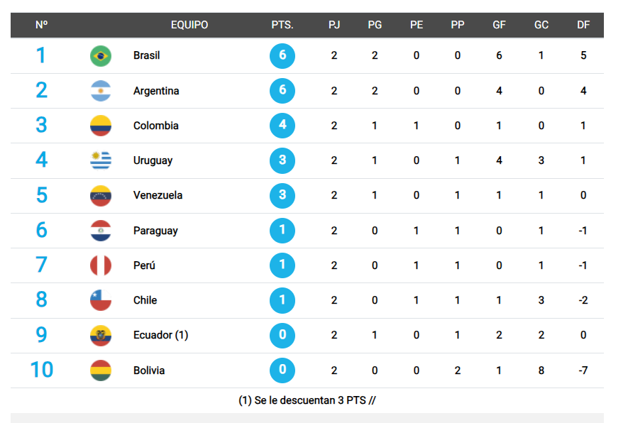 DEPORTESResultados de las Eliminatorias Sudamericanas: Tabla de posiciones en la fecha 2 13 septiembre, 2023 - Deja un comentario Estos son los resultados de la segunda fecha de las Eliminatorias Sudamericanas rumbo al Mundial 2026. Bolivia 0 – 3 Argentina Ecuador 2 – 1 Uruguay Venezuela 1 – 0 Paraguay Chile 0 – 0 Colombia Perú 1-0 Brasil