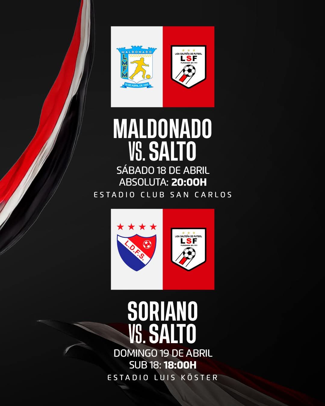 DEPORTESSalto en busca del título de visitante en Sub – 18 y Absoluta 14 abril, 2026 FINAL – VUELTA ABSOLUTA Maldonado ️ Sábado 18/4 ️ Estadio Club San Carlos (San Carlos) 20:00H Televisado SUB 18 Soriano ️ Domingo 19/4 ️Luis Köster (Mercedes) 18:00H Televisado ✔️ Fase Nacional #ElEquipoDeTodos ⚫️⚪