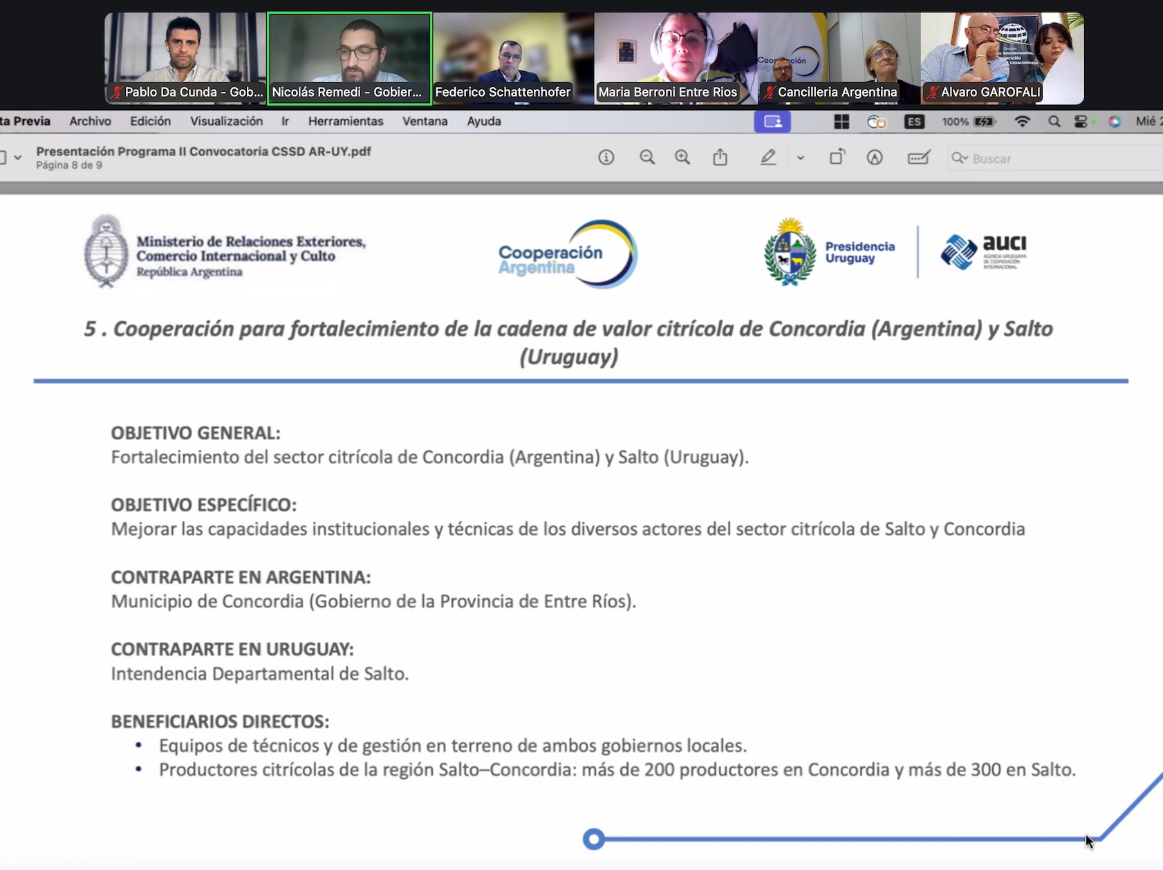 El Gobierno de Salto presentó ante la Agencia Uruguaya de Cooperación Internacional (AUCI) y Cooperación Argentina el proyecto de cooperación descentralizada que fue seleccionado para su implementación junto al Gobierno de Entre Ríos, la Municipalidad de Concordia y distintos actores institucionales de la región.