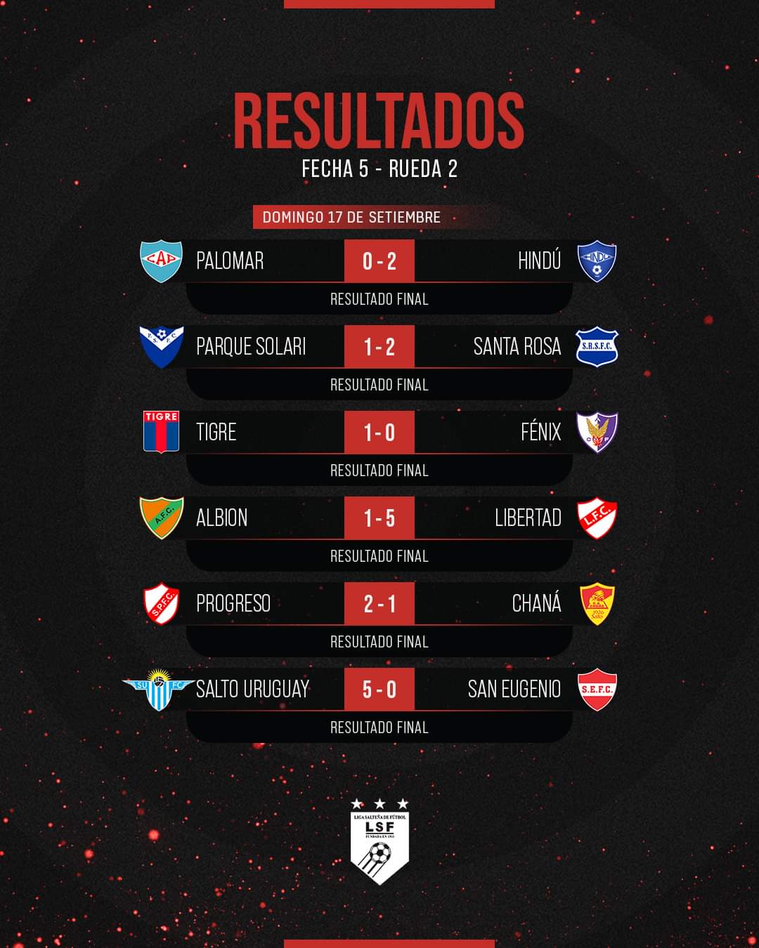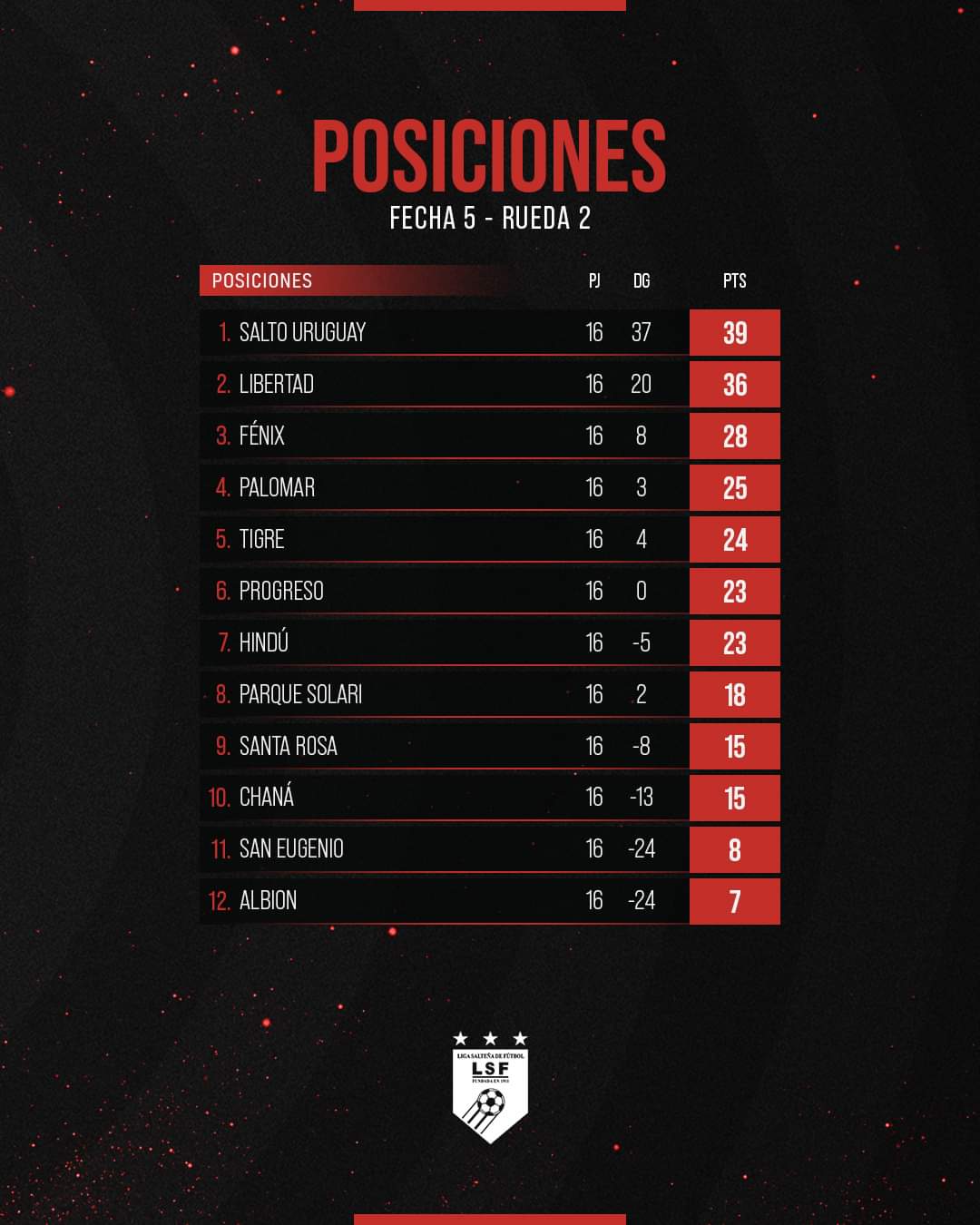 DEPORTES / NOTICIASSalto Uruguay se consagró campeón y retorna a la Divisional Primera A 18 septiembre, 202321 septiembre, 2023 - Deja un comentario – Resultados al término de la de la en la Divisional Primera «B». ́ Salto Uruguay Libertad Tigre Fénix Palomar #DivisionalB Posiciones en el Descenso al término de la de la en la Divisional Primera «B». San Eugenio Albion #DivisionalB