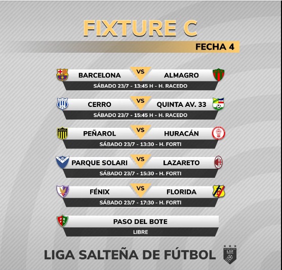 DEPORTESSe juega la cuarta fecha de la primera rueda de la Divisional «C» 21 julio, 2022 - Deja un comentario SECTORES H. Racedo Oeste: Barcelona y Cerro. H. Forti Oeste: Peñarol, Parque Solari y Florida. #PrimeraC