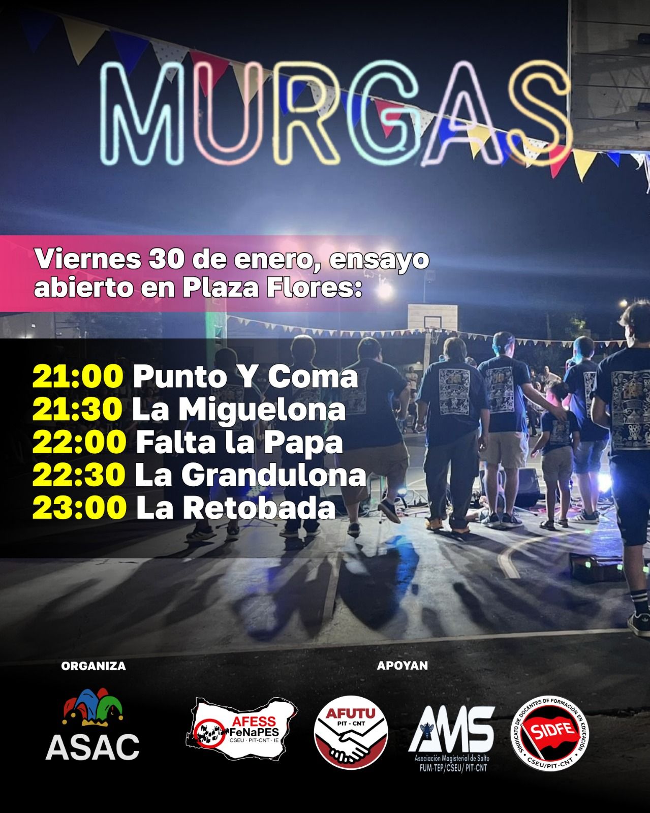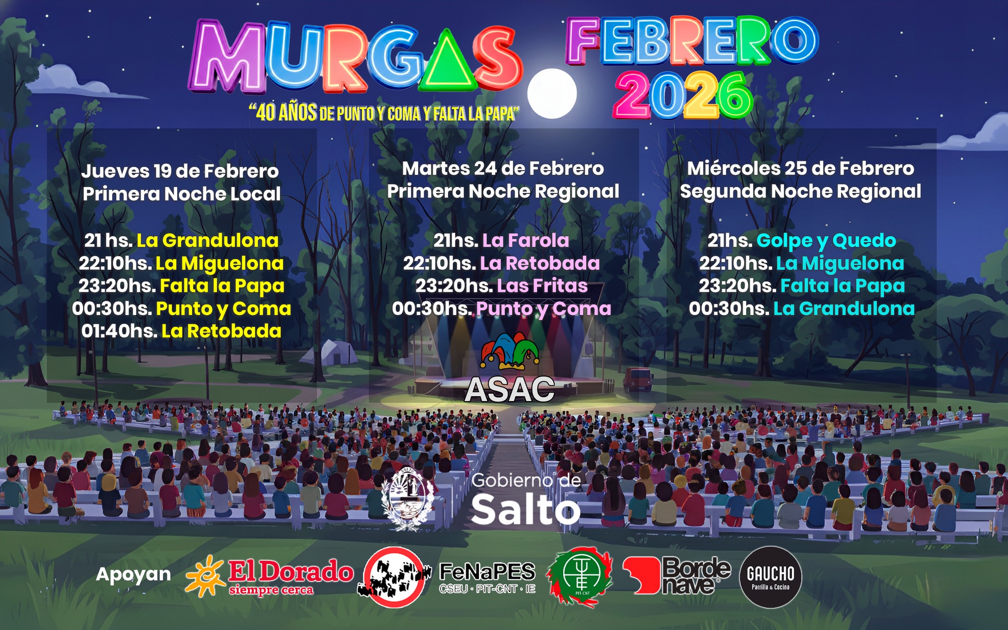 Desde ASAC se comunica que las murgas continúan preparando sus espectáculos para el Concurso “40 años de Punto y Coma y Falta la Papa”, que se desarrollará los días 19, 24, 25 y 27 de febrero.