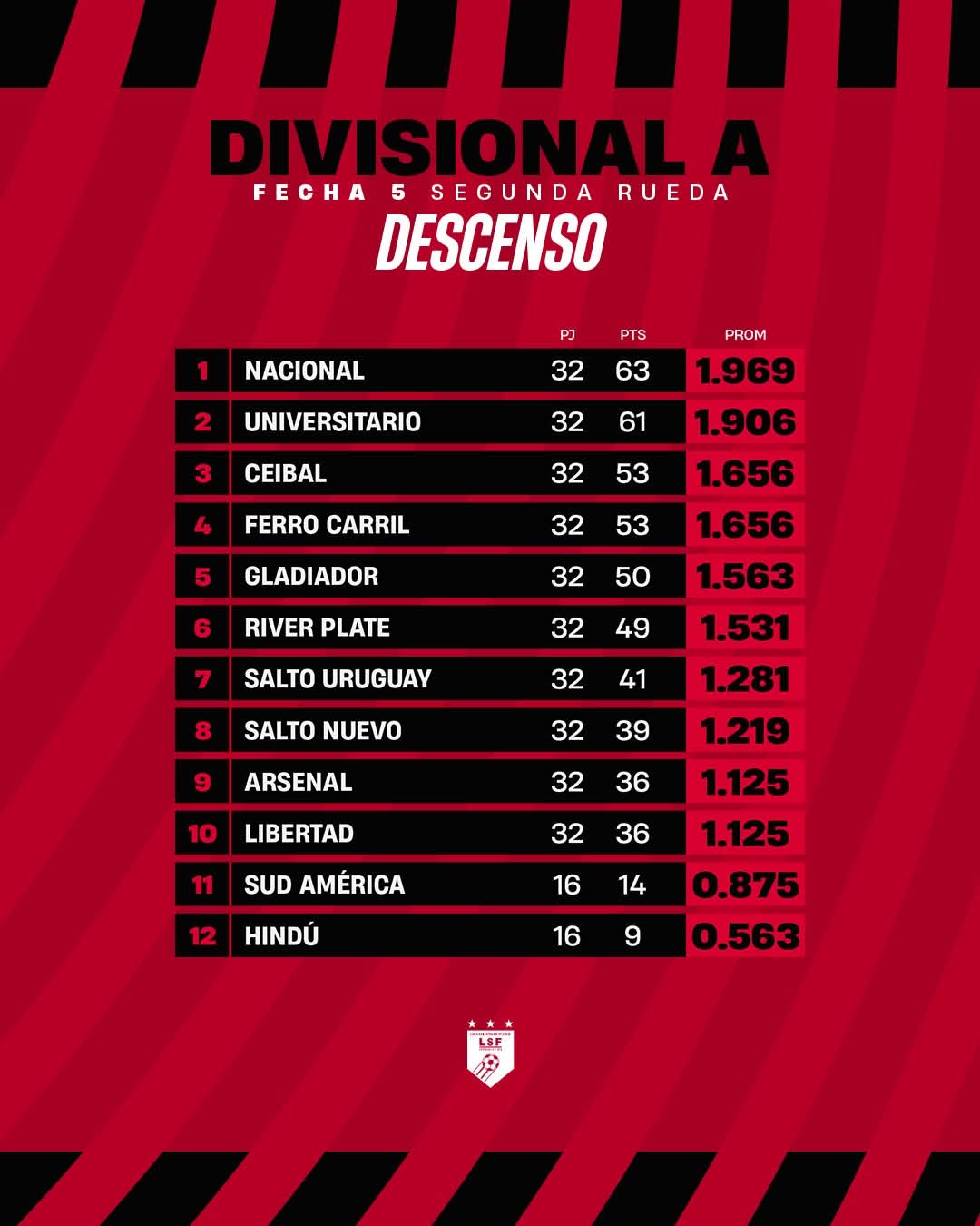 Nota: Con los resultados registrados en la jornada de hoy, queda confirmado el descenso de Sud América, que acompañará a Hindú a la Divisional Primera “B”.