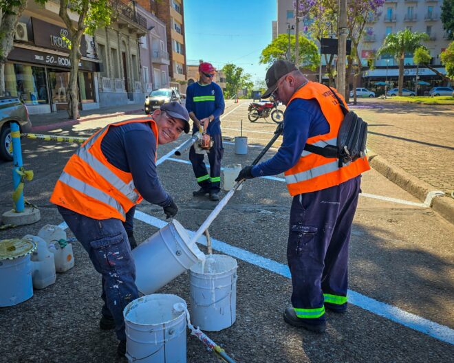 Los trabajos comenzaron con la pintura de cebras, cordones y señalizaciones horizontales en calle Uruguay, en la cuadra de Plaza Artigas, y se extenderán a distintas arterias del microcentro.