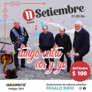 Hacía tiempo que queríamos concretar este evento, de la mano de TANGO ENTRE VOS Y YO, estos profesionales de la música y el escenario, vienen para brindarnos un gran show. Está integrado por Luciano Campo en la voz, Julio Gómez en el bajo, Carlos Seyanes acordeón y Yony Rodríguez guitarra. Las entradas ya están en venta a $ 100 y es conveniente reservar mesa con tiempo! al 092 899 066