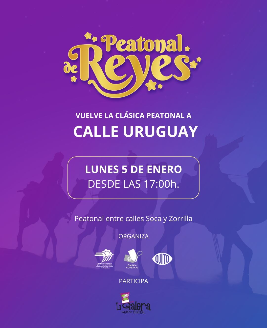 La Peatonal de Reyes es impulsada por el Centro Comercial e Industrial de Salto y cuenta con la co-organización de Ojito Comunicación, en un trabajo conjunto que busca fortalecer el comercio local, promover el encuentro ciudadano y sostener tradiciones que forman parte de la