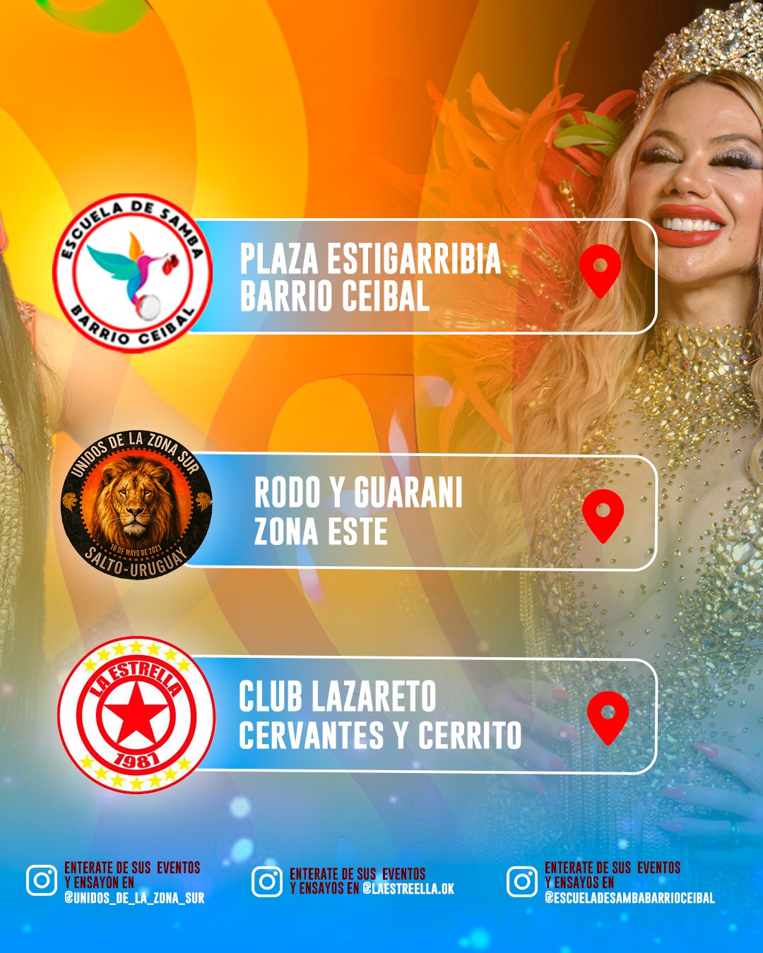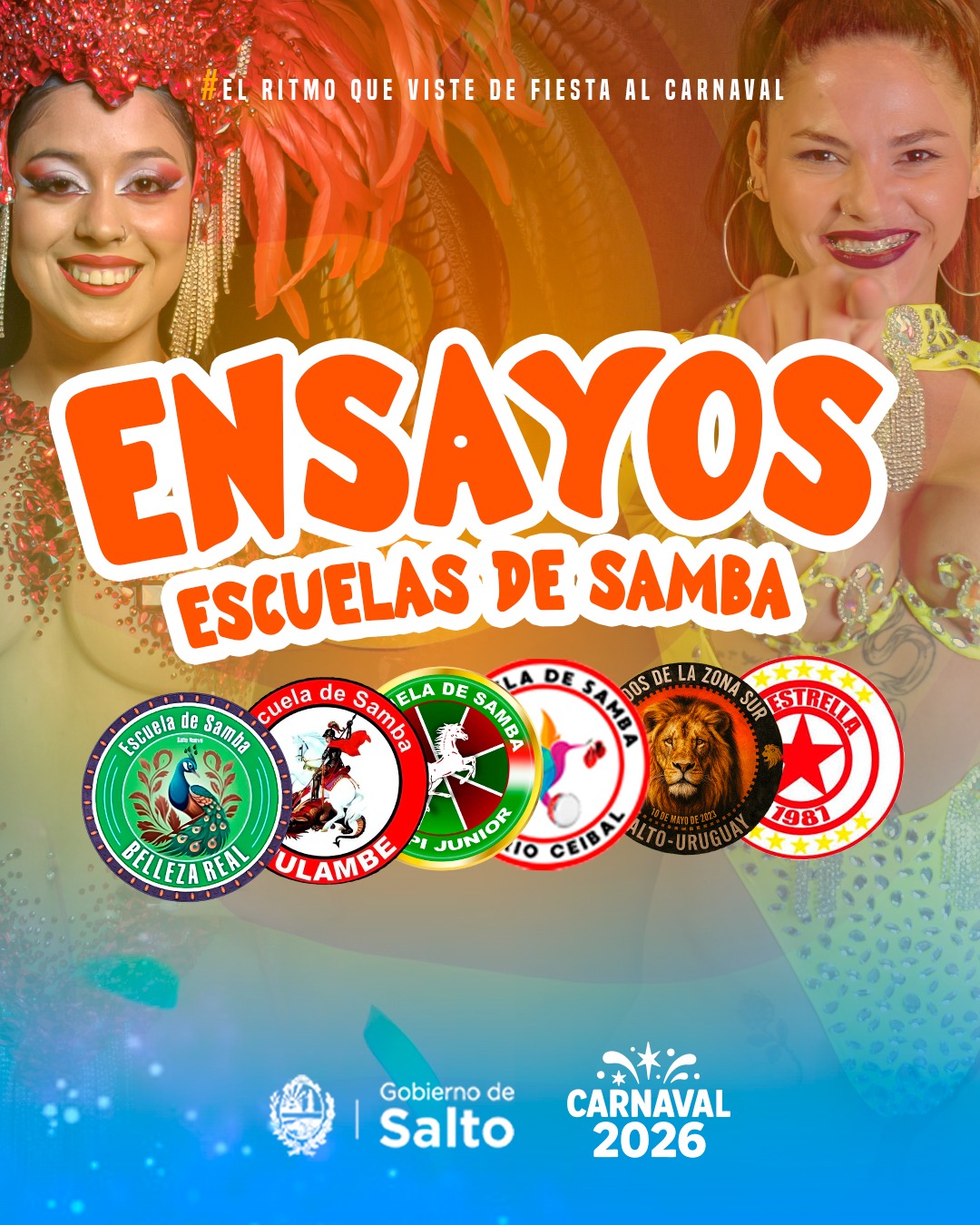 Las Escuelas de Samba de Salto ya se preparan para el Carnaval de Salto 2026 y dieron a conocer sus distintos lugares de ensayo, para que el público los acompañe en cada ocasión y ya se vaya viviendo la gran fiesta popular del departamento, que este año viene con todo.